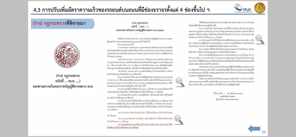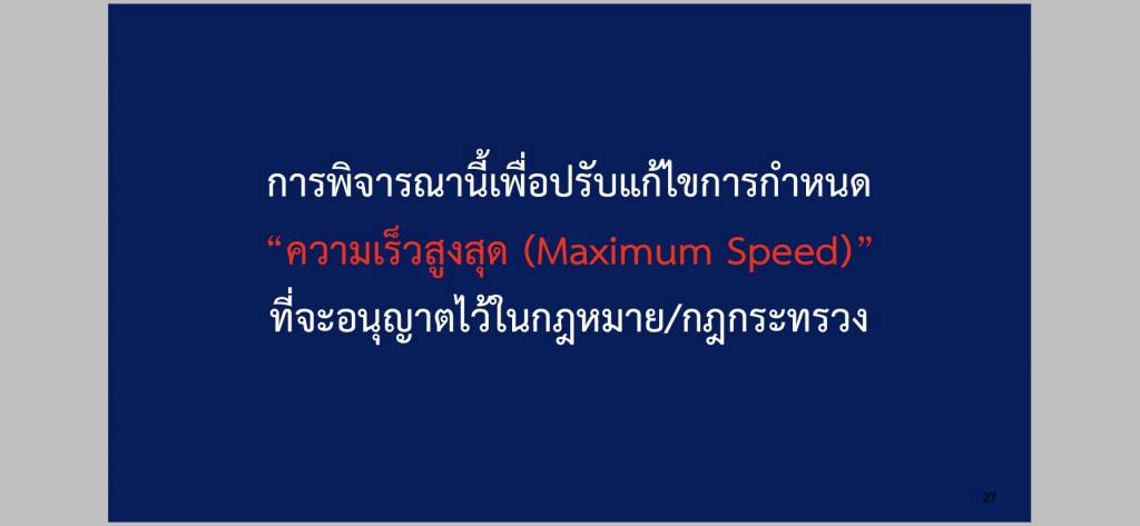 นายศักดิ์สยาม กล่าวว่า ก่อนหน้านี้ได้นำเรื่องดังกล่าวนำเสนอต่อที่ประชุมคณะกรรมการจราจรกลาง (คจร.) ซึ่งมีพลเอกประวิตร วงษ์สุวรรณ รองนายกรัฐมนตรี เป็นประธาน โดยได้อนุมัติเห็นชอบในตามหลักการให้เป็นกฎกระทรวงคมนาคม ฉบับที่ ปีพ.ศ. 2553 โดยการกำหนดอัตราความเร็วสูงสุดเป็น 120 กิโลเมตรต่อชั่วโมง จะมีการกำหนดประเภทถนนที่ใช้ความเร็วดังกล่าวได้ โดยเป็นทางหลวงแผ่นดิน ทางหลวงชนบทที่มีช่องเดินรถทิศทางเดียวกันตั้งแต่ 2 ช่องขึ้นไป (4 ช่องจราจร ไป-กลับ) เป็นถนนที่มีเกาะกลางถนนแบบกำแพงกั้น (Barrier Median) และไม่มีจุดกลับรถเสมอระดับถนน โดยมีสะพานกลับรถ หรือทางลอด และกำหนดอัตราความเร็วต่ำสุดในช่องขวาสุด (Low Speed) ไว้ ไม่ต่ำกว่า 100 กม.ต่อชม.