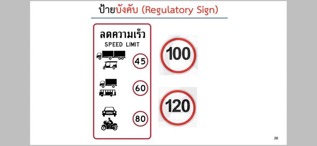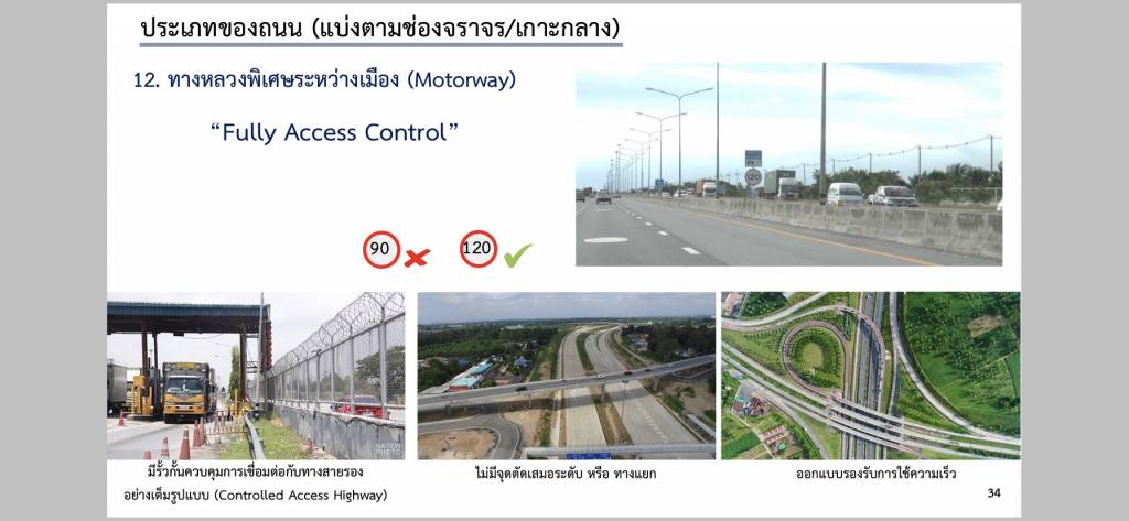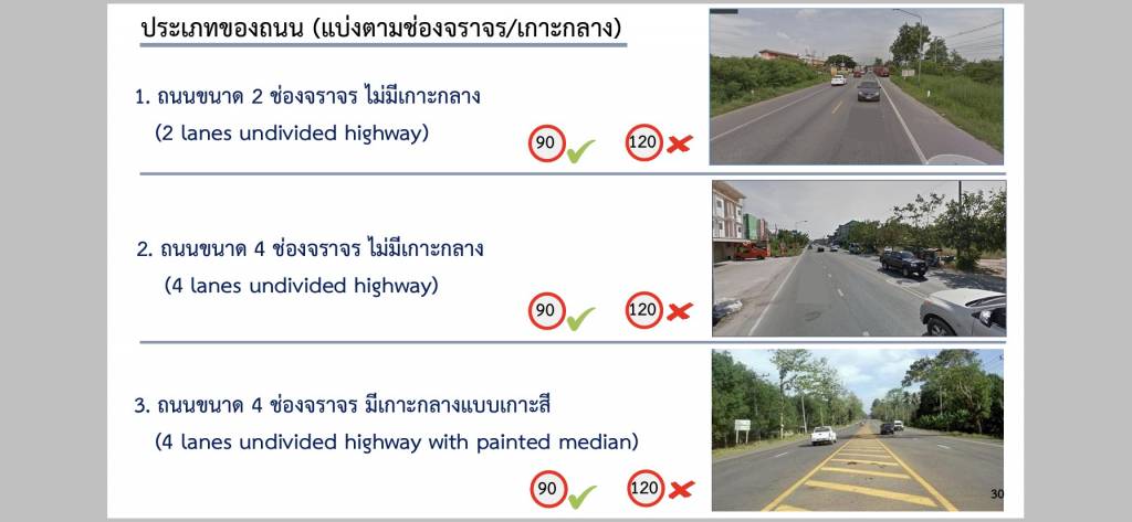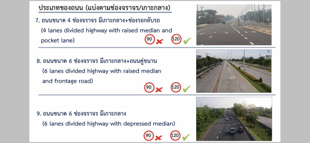 สำหรับร่างกฎกระทรวงดังกล่าว ยังได้กำหนดอัตราความเร็วสูงสุดเป็น 120 กิโลเมตรต่อชั่วโมง และกำหนดประเภทถนนที่ใช้ความเร็วดังกล่าวได้ กล่าวคือ ทางหลวงแผ่นดิน ทางหลวงชนบท ที่มีช่องเดินรถทิศทางเดียวกันตั้งแต่ 2 ช่องขึ้นไป เฉพาะถนนที่มีเกาะกลางถนนแบบกำแพงกั้น (Barrier Median) และไม่มีจุดกลับรถเสมอระดับถนน ตลอดจนกำหนดอัตราความเร็วต่ำสุดในช่องขวา ให้ไม่ต่ำกว่า 100 กิโลเมตรต่อชั่วโมง