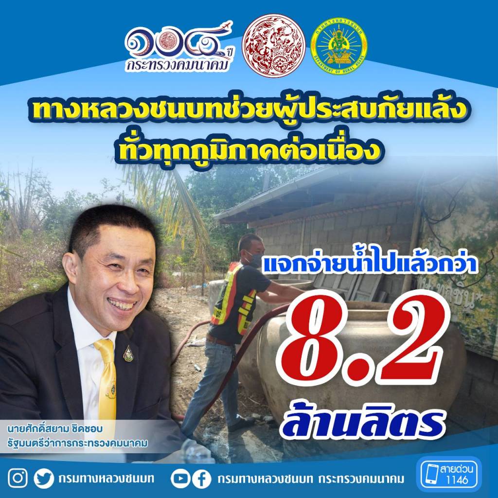"ทางหลวงชนบท" สอดรับนโยบายรัฐมนตรีว่าการกระทรวงคมนาคม ช่วยผู้ประสบภัยแล้งทั่วทุกภูมิภาคต่อเนื่อง แจกจ่ายน้ำไปแล้วกว่า 8.2 ล้านลิตร