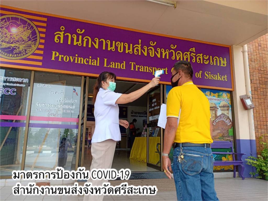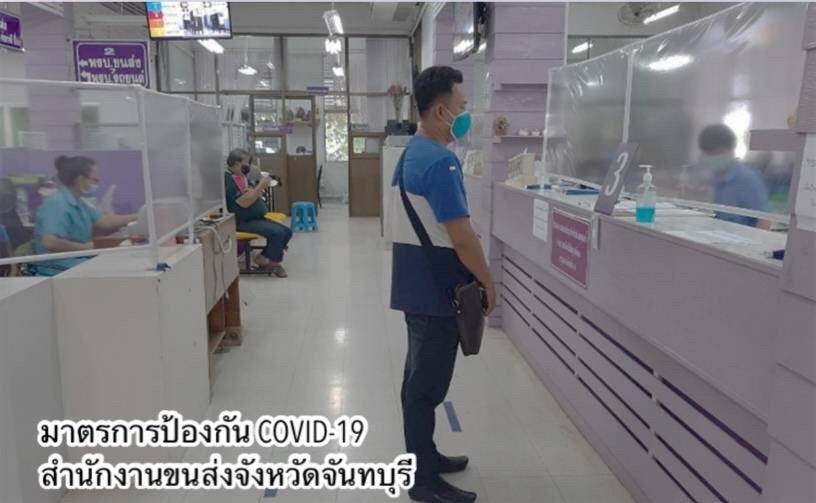 •ด้านอาคารสถานที่และสิ่งอำนวยความสะดวกในหน่วยงาน ทำความสะอาดฆ่าเชื้อโรคพื้นที่ให้บริการภายในสำนักงานขนส่งทุกวัน โดยเฉพาะจุดที่มีการสัมผัสบ่อยครั้ง เช่น เคาน์เตอร์บริการ ที่จับประตู ที่จับราวบันได ปุ่มกดลิฟต์ เป็นต้น และจัดให้มีสบู่ในห้องน้ำ เจลแอลกอฮอล์ล้างมือที่เคาน์เตอร์ให้บริการและจุดประชาสัมพันธ์