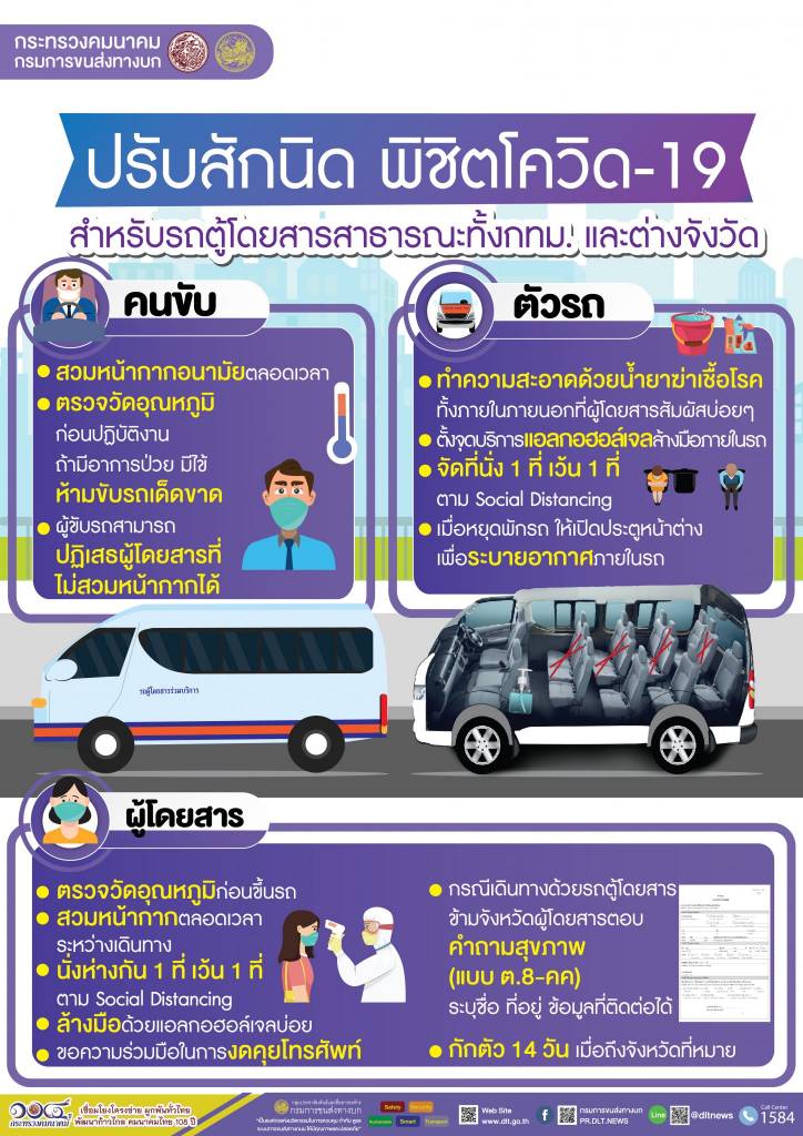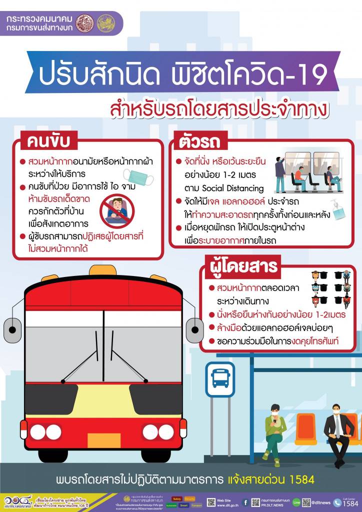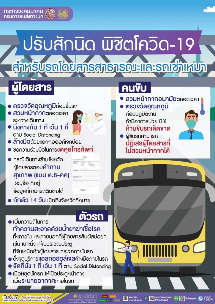 28 เมษายน 2563 เวลา 11:28กรมการขนส่งทางบก แนะ!!! ปรับเปลี่ยนวิถีชีวิตเลี่ยงโควิด-19 เดินทางด้วยรถโดยสารสาธารณะ สวมหน้ากากอนามัยหรือหน้ากากผ้าทุกครั้งตลอดการเดินทางทั้งผู้โดยสารและผู้ขับรถนายจิรุตม์ วิศาลจิตร อธิบดีกรมการขนส่งทางบก เปิดเผยว่า ตามที่นายศักดิ์สยาม ชิดชอบ รัฐมนตรีว่าการกระทรวงคมนาคม ได้กำชับให้หน่วยงานในสังกัดกระทรวงคมนาคม มีมาตรการการป้องกันและควบคุมไม่ให้มีการแพร่ระบาดโรคติดเชื้อไวรัสโคโรนา 2019 (COVID-19) ในระบบขนส่งสาธารณะ โดยกรมการขนส่งทางบกได้กำชับไปยังผู้ประกอบการขนส่ง ผู้ให้บริการขนส่งด้วยรถโดยสารสาธารณะทุกประเภท รวมถึงผู้ให้บริการสถานีขนส่งผู้โดยสารทุกแห่ง ดำเนินการตามนโยบายและมาตรการต่างๆ ของรัฐบาลและกระทรวงคมนาคมอย่างเคร่งครัด ประชาสัมพันธ์แนะนำประชาชนที่เดินทางด้วยรถโดยสารสาธารณะทุกประเภท เช่น รถโดยสารประจำทาง รถแท็กซี่ รถสองแถว หรือรถจักรยานยนต์รับจ้าง ให้สวมหน้ากากอนามัยหรือหน้ากากผ้าทุกครั้ง งดพูดคุยโทรศัพท์ในระหว่างการโดยสารรถสาธารณะ และควรล้างมือด้วยแอลกอฮอล์ชนิดเจลหรือน้ำทุกครั้งที่มีการสัมผัสพื้นผิวต่างๆ ในที่สาธารณะ กรณีโดยสารรถแท็กซี่ควรนั่งตอนหลังของรถเพื่อเว้นระยะห่างระหว่างผู้ขับรถและผู้โดยสาร ลดความเสี่ยงการติดต่อ ในส่วนของผู้ขับรถโดยสารสาธารณะทุกประเภท แนะนำให้สังเกตอาการตนเองอยู่เสมอ หากป่วย มีอาการไข้ ไอ จาม ห้ามขับรถเด็ดขาด ควรกักตัวที่บ้านเพื่อสังเกตอาการ และขณะให้บริการหมั่นล้างมือด้วยแอลกอฮอล์ชนิดเจลหรือน้ำบ่อยๆ และสวมหน้ากากอนามัยหรือหน้ากากผ้าตลอดระยะเวลาให้บริการ หากในระหว่างขับรถมีผู้โดยสารไอ จาม ให้ปิดแอร์แล้วเปิดหน้าต่างระบายอากาศ เพื่อไม่ให้เชื้อไวรัสสะสมอยู่ในรถ ลดโอกาสการติดเชื้อของผู้ขับรถและผู้โดยสารท่านอื่น ด้านการดูแลความสะอาดภายในรถโดยสารสาธารณะ ควรจัดให้มีแอลกอฮอล์ชนิดเจลหรือน้ำ ประจำรถ หมั่นเปิดหน้าต่างให้อากาศภายนอกหมุนเวียน หรือเปิดหน้าต่างระหว่างให้บริการ ต้องทำความสะอาดรถทุกครั้งทั้งก่อนและหลังการให้บริการ โดยเช็ดทำความสะอาดบริเวณที่มีผู้โดยสารสัมผัสบ่อยๆ กรณีให้บริการผู้โดยสารที่ มีการไอ จาม หรือ ไม่สบาย ระหว่างเดินทาง ควรใช้แอลกอฮอล์ 70% ในการทำความสะอาดภายในรถ นอกจากนั้น เมื่อมีเวลาพัก ควรเปิดประตูและหน้าต่างรถหรือเปิดช่องระบายอากาศ เพื่อระบายอากาศภายในรถ อธิบดีกรมการขนส่งทางบก กล่าวเพิ่มเติมว่า ทั้งนี้ การให้บริการของรถโดยสารสาธารณะและการให้บริการที่สถานีขนส่งผู้โดยสาร 