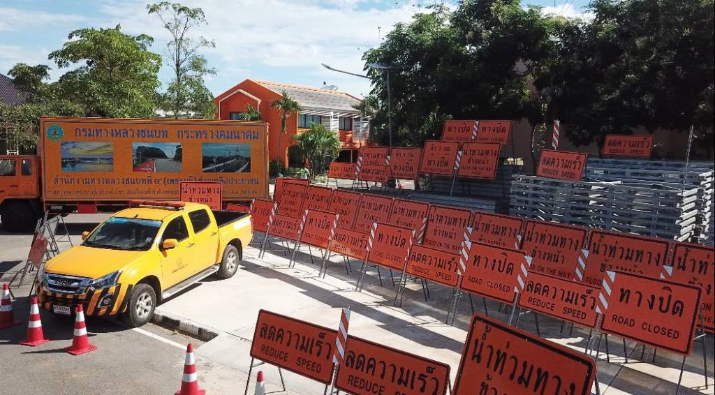 - เตรียมป้ายเตือน ป้ายแนะนำเส้นทาง หลักนำทาง (กำหนดช่องจราจร) เพื่ออำนวยความสะดวกให้แก่ประชาชน กรณีมีน้ำท่วมสูง ถนนขาด/สะพานขาด ไม่สามารถสัญจรไปมาได้