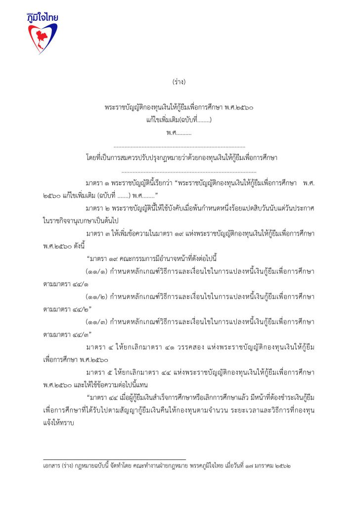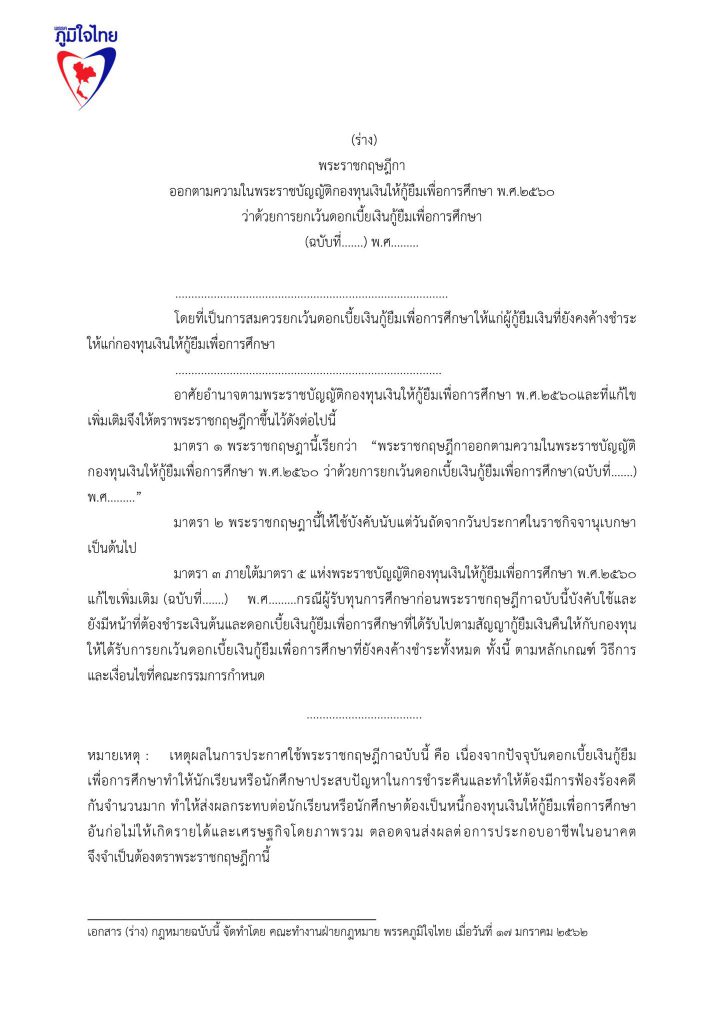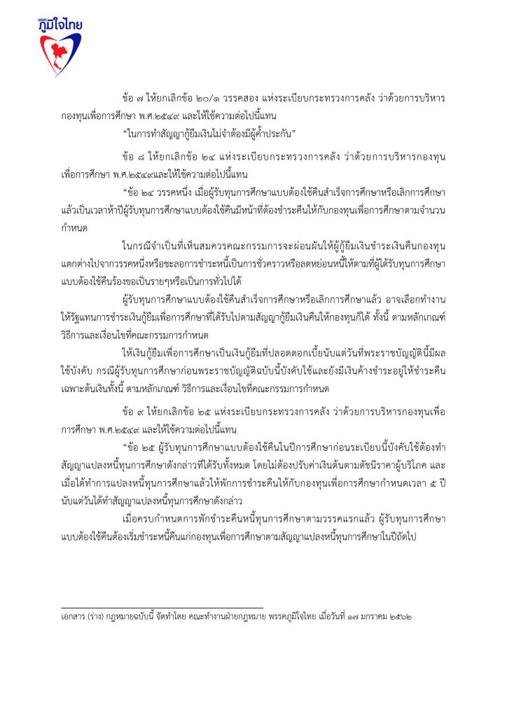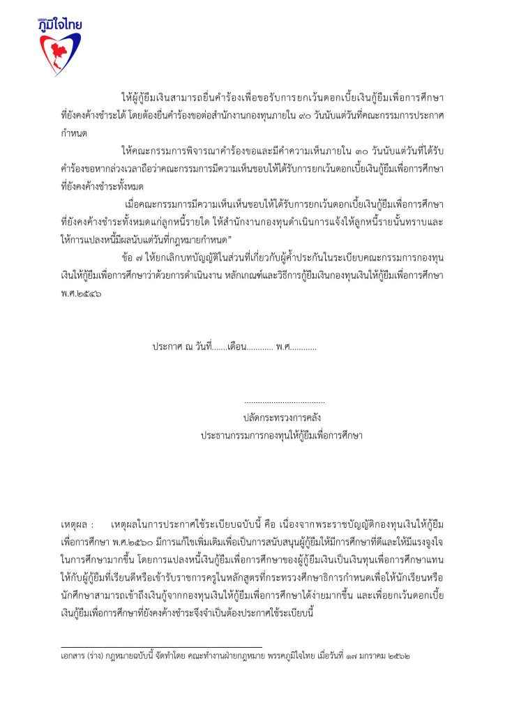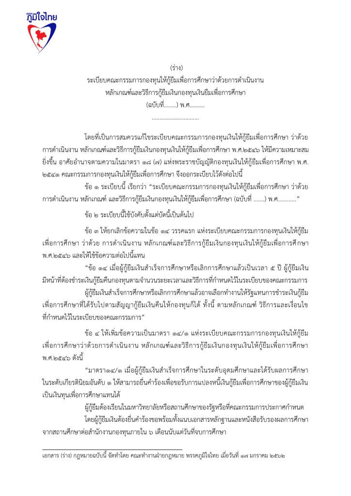 17 มกราคม 2562 เวลา 19:22ร่วมลงชื่อ ... ร่างแก้ไขกฎหมายกองทุนให้กู้ยืมเพื่อการศึกษา (กยศ.)ลดอำนาจรัฐ แก้หนี้ กยศ. แก้กฎหมาย กยศ. พักหนี้ 5 ปี ไม่มีดอกเบี้ย ยกเลิกค่าปรับ ปลดภาระผู้ค้ำปรัน ผ่อนคืนเงินต้น 10 ปี ..เพื่อปากท้องประชาชน ปัจจุบันกองทุนเงินให้กู้ยืมเพื่อการศึกษา ให้นักเรียน นักศึกษา กู้เงินแล้ว 5.3 ล้านราย ใช้เงินไปทั้งสิ้น กว่า 5.5 แสนล้านบาท มีผู้ชดใช้เงินยืมเสร็จสิ้นแล้วเกือบ 8 แสนคน โดยคนเกี่ยวข้อง ประกอบไปด้วยผู้กู้ 1 คน มีผู้ค้ำประกัน 2 คน รวมผู้เกี่ยวข้องกว่า 16 ล้านคน หนี้ กยศ. เป็นปัญหาใหญ่ที่เหมือนระเบิดเวลาของประเทศไทย อีกลูกหนึ่ง และ เป็นปัญหาที่ทำให้ ประเทศไทย มีโอกาสสูญเสียทรัพยากรมนุษย์ ที่ได้รับการศึกษาสูงระดับปริญญา นับล้านคน เป็นทรัพยากรมนุษย์ที่เป็นหนี้เสียของประเทศไทย พรรคภูมิใจไทยจึงนำเสนอการแก้ไขปัญหาของ กองทุนเงินให้กู้ยืมเพื่อการศึกษา ด้วยมาตรการ 5 ด้าน ดังนี้ 1.พักหนี้ 5 ปี หรือ ขยายเวลาปลอดหนี้ จาก ปัจจุบัน 2 ปี เป็น 5 ปี หลังจบการศึกษาระดับปริญญาตรี 2.ปลดภาระผู้ค้ำประกันทันที 3. ไม่มีดอกเบี้ย 4. ไม่ต้องมีเบี้ยปรับ 5. เอาคืนแค่เงินต้น 6. พักหนี้ 5 ปี สำหรับ ลูกหลาน ที่ไม่มีความสามารถชำระหนี้ พรรคภูมิใจไทย จึงขอความสนับสนุนในการเข้าชื่อเพื่อแก้ไขกฎหมาย ร่างพ.ร.บ.กองทุนเงินให้กู้ยืมเพื่อการศึกษา แชร์บทความนี้: