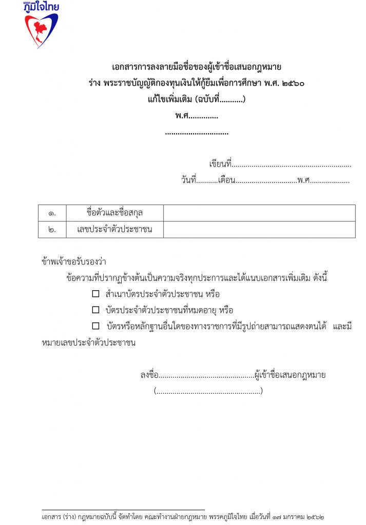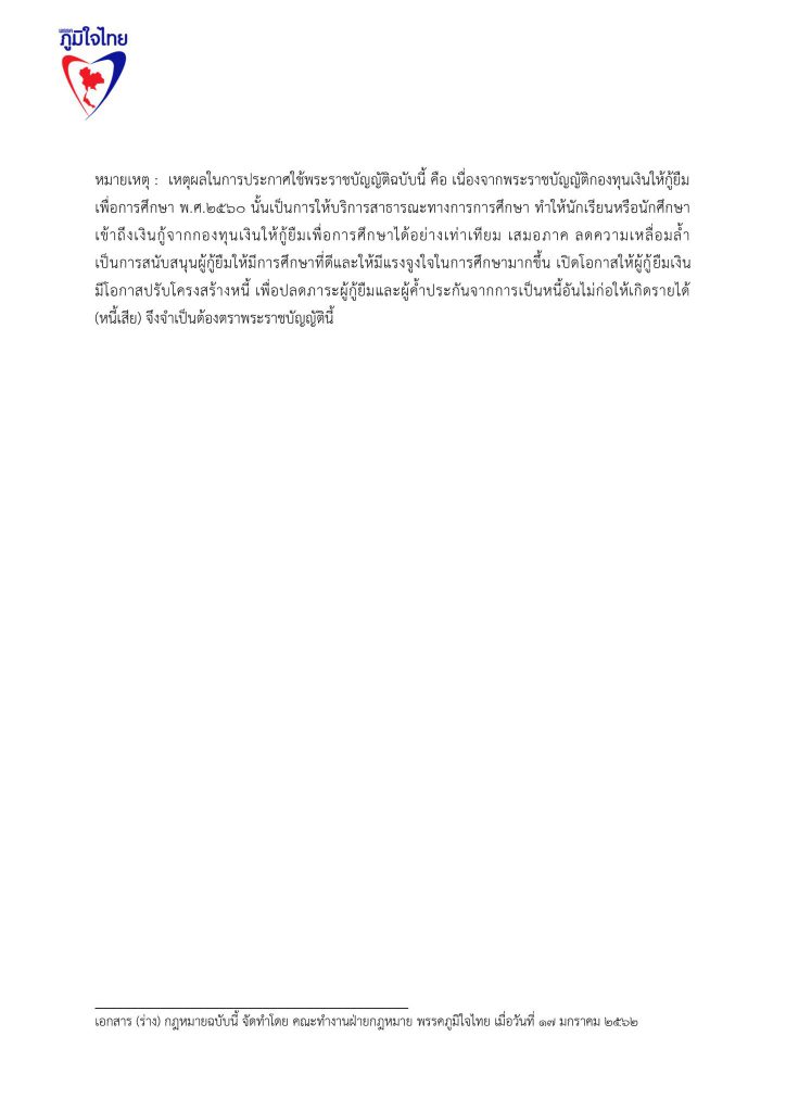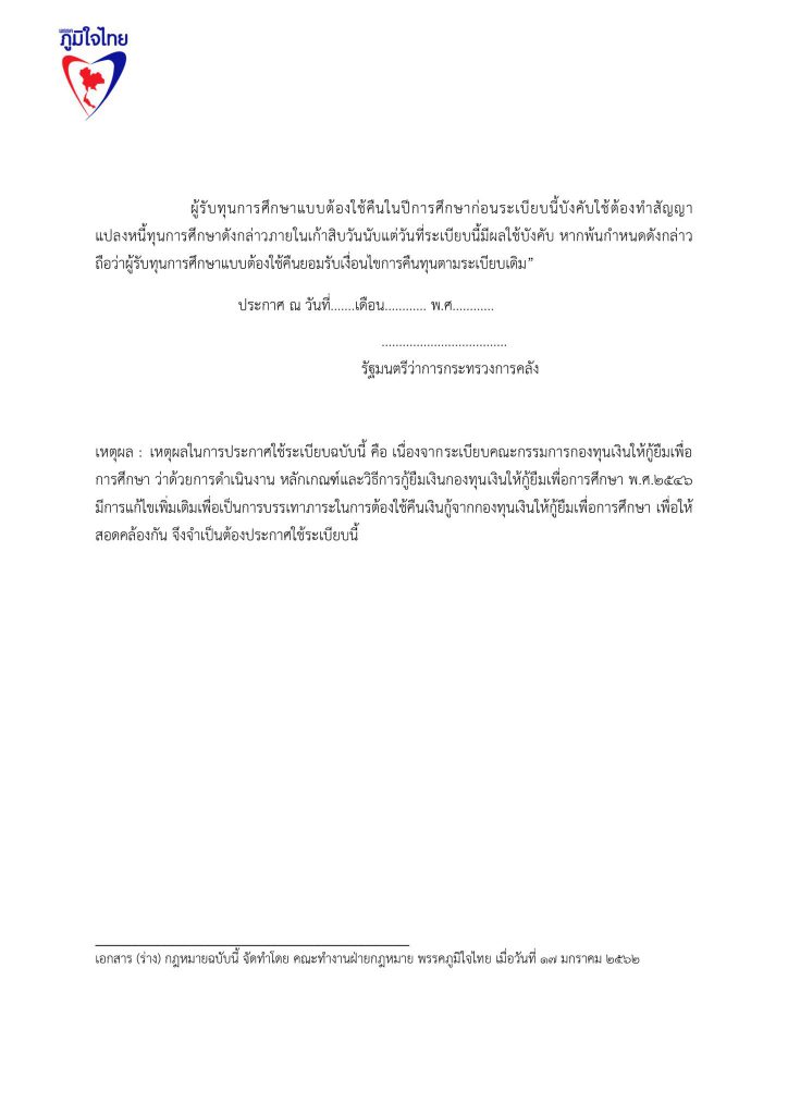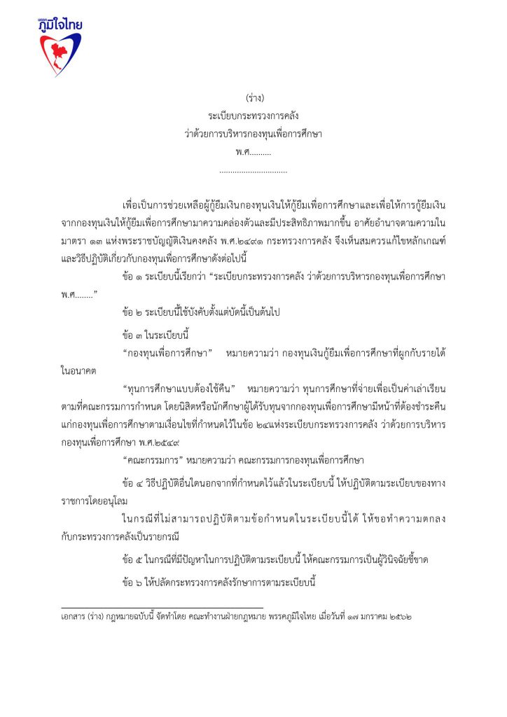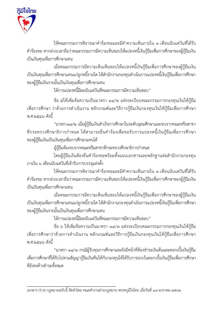 17 มกราคม 2562 เวลา 19:22ร่วมลงชื่อ ... ร่างแก้ไขกฎหมายกองทุนให้กู้ยืมเพื่อการศึกษา (กยศ.)ลดอำนาจรัฐ แก้หนี้ กยศ. แก้กฎหมาย กยศ. พักหนี้ 5 ปี ไม่มีดอกเบี้ย ยกเลิกค่าปรับ ปลดภาระผู้ค้ำปรัน ผ่อนคืนเงินต้น 10 ปี ..เพื่อปากท้องประชาชน ปัจจุบันกองทุนเงินให้กู้ยืมเพื่อการศึกษา ให้นักเรียน นักศึกษา กู้เงินแล้ว 5.3 ล้านราย ใช้เงินไปทั้งสิ้น กว่า 5.5 แสนล้านบาท มีผู้ชดใช้เงินยืมเสร็จสิ้นแล้วเกือบ 8 แสนคน โดยคนเกี่ยวข้อง ประกอบไปด้วยผู้กู้ 1 คน มีผู้ค้ำประกัน 2 คน รวมผู้เกี่ยวข้องกว่า 16 ล้านคน หนี้ กยศ. เป็นปัญหาใหญ่ที่เหมือนระเบิดเวลาของประเทศไทย อีกลูกหนึ่ง และ เป็นปัญหาที่ทำให้ ประเทศไทย มีโอกาสสูญเสียทรัพยากรมนุษย์ ที่ได้รับการศึกษาสูงระดับปริญญา นับล้านคน เป็นทรัพยากรมนุษย์ที่เป็นหนี้เสียของประเทศไทย พรรคภูมิใจไทยจึงนำเสนอการแก้ไขปัญหาของ กองทุนเงินให้กู้ยืมเพื่อการศึกษา ด้วยมาตรการ 5 ด้าน ดังนี้ 1.พักหนี้ 5 ปี หรือ ขยายเวลาปลอดหนี้ จาก ปัจจุบัน 2 ปี เป็น 5 ปี หลังจบการศึกษาระดับปริญญาตรี 2.ปลดภาระผู้ค้ำประกันทันที 3. ไม่มีดอกเบี้ย 4. ไม่ต้องมีเบี้ยปรับ 5. เอาคืนแค่เงินต้น 6. พักหนี้ 5 ปี สำหรับ ลูกหลาน ที่ไม่มีความสามารถชำระหนี้ พรรคภูมิใจไทย จึงขอความสนับสนุนในการเข้าชื่อเพื่อแก้ไขกฎหมาย ร่างพ.ร.บ.กองทุนเงินให้กู้ยืมเพื่อการศึกษา แชร์บทความนี้: