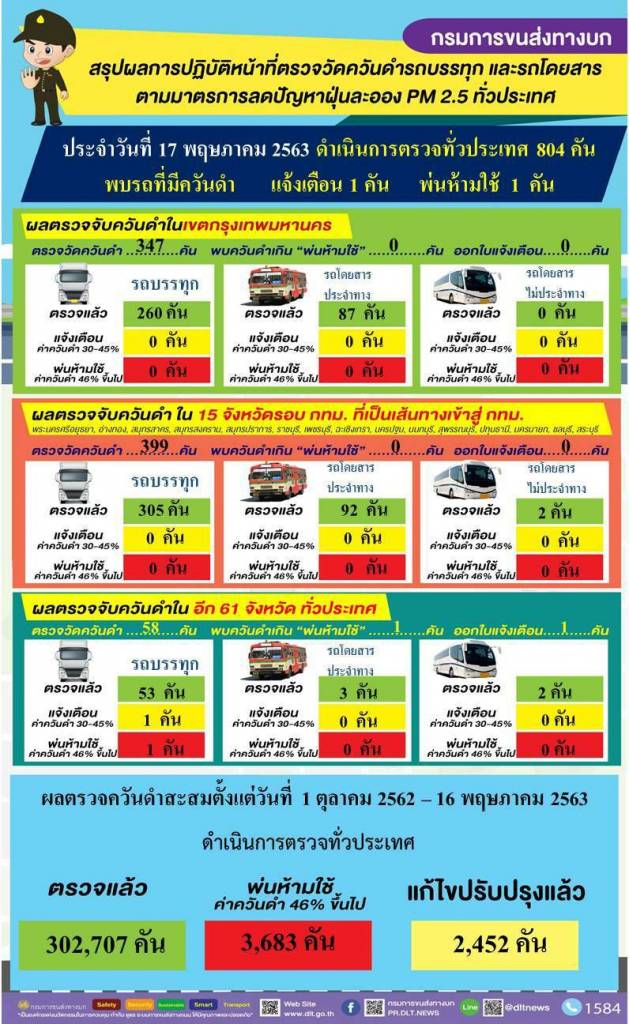 ด้าน นายจิรุตม์ วิศาลจิตร อธิบดีกรมการขนส่งทางบก เผยผลการดำเนินการ วันที่ 17 พฤษภาคม 2563 ดำเนินการตรวจวัดควันดำรถโดยสารและรถบรรทุกทั่วประเทศ จำนวน 804 คัน พบรถที่มีค่าควันดำเกินเกณฑ์มาตรฐานที่ราชการกำหนด จำนวน 1 คัน และพบรถที่มีค่าควันดำ 30 - 45 % ได้ออกใบเตือน จำนวน 1 คัน เพื่อให้ผู้ประกอบการไปบำรุงดูแลรักษารถไม่ให้มีค่าควันดำเกิน แบ่งเป็น ดังนี้