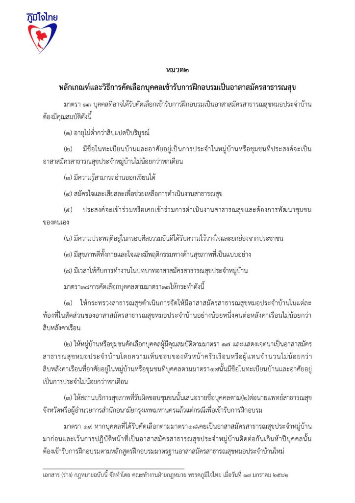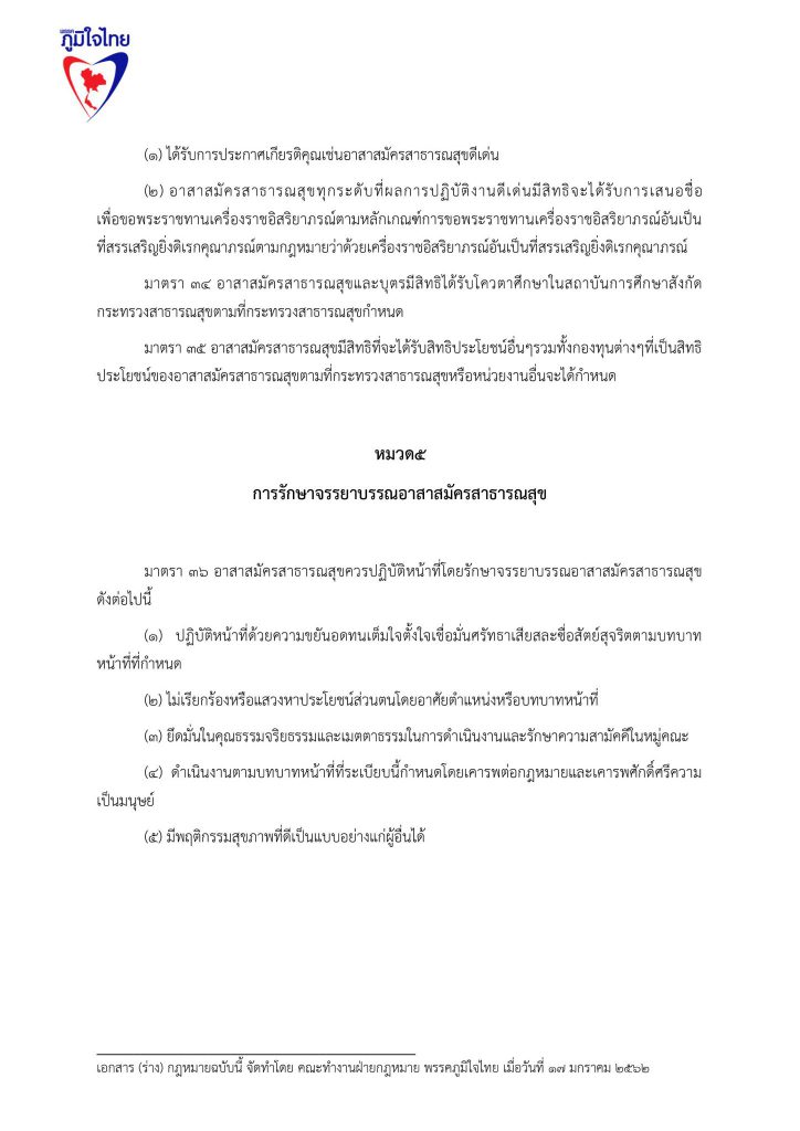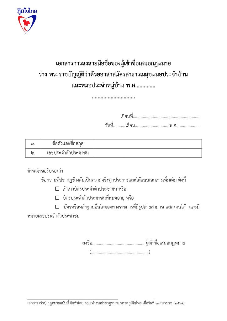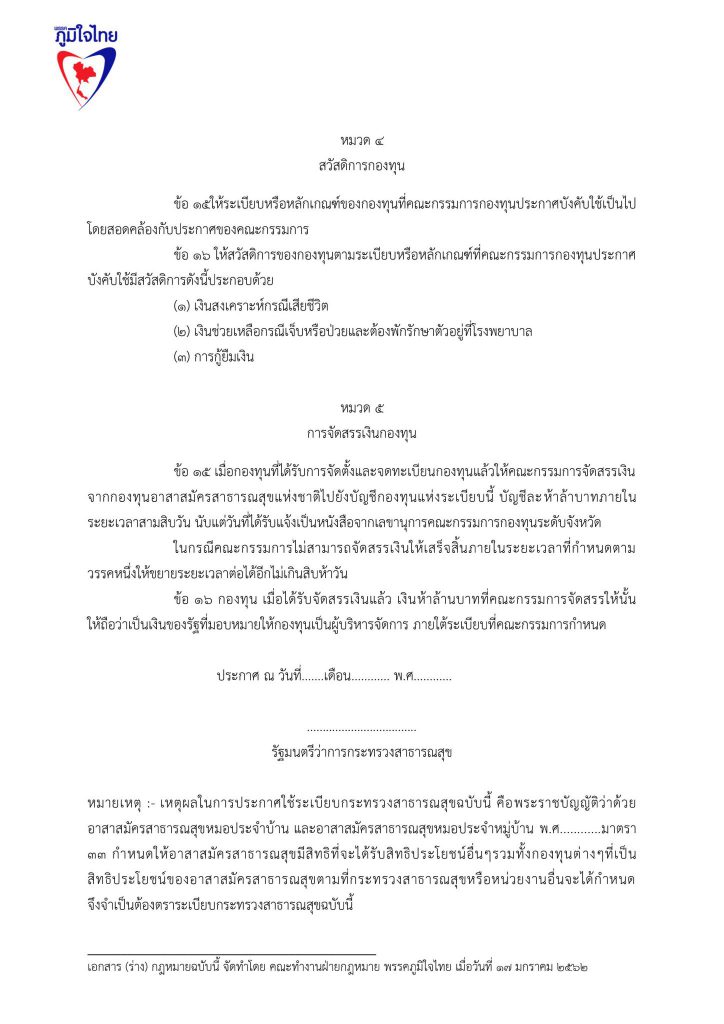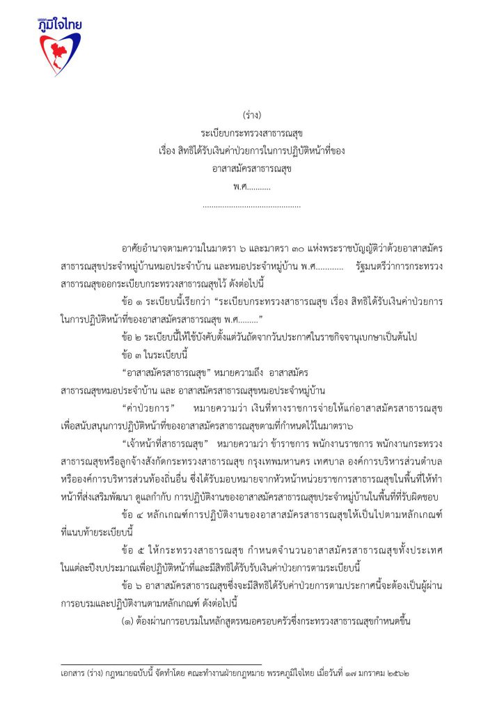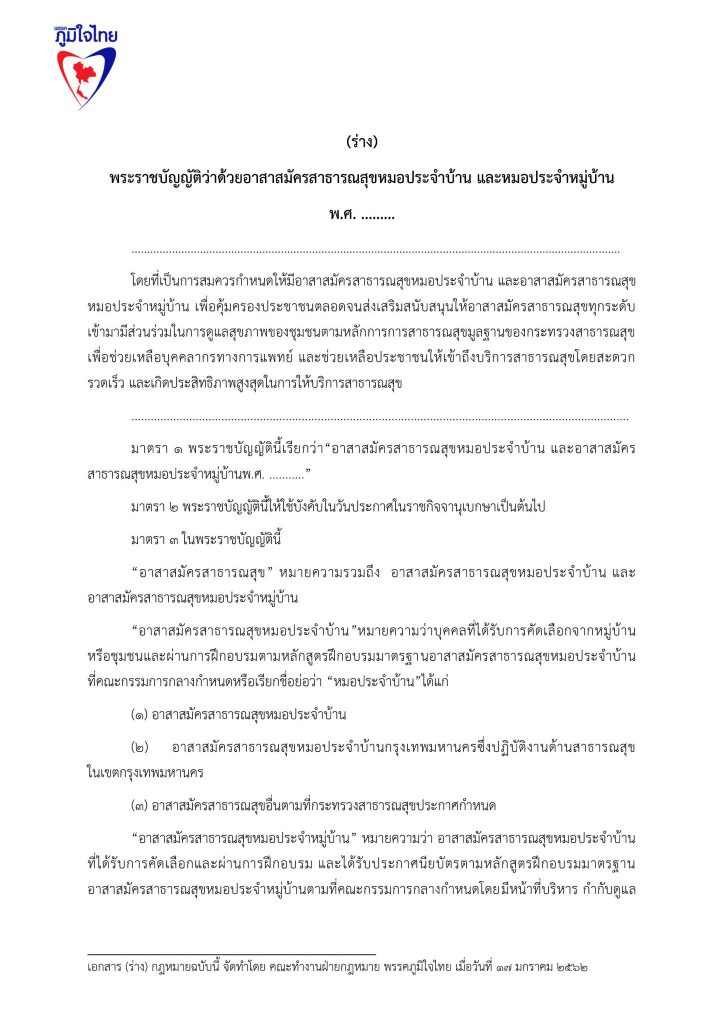 17 มกราคม 2562 เวลา 19:22ร่วมลงชื่อ … ร่างแก้ไขกฎหมาย อสม.เป็นหมอประจำบ้านพรรคภูมิใจไทย ลดอำนาจรัฐ .. ยกระดับ อสม.เป็นหมอประจำบ้าน ค่าตอบแทน 2,500-10,000 ..เพื่อปากท้องประชาชน อสม.ทั่วประเทศ 1.06 ล้านคน ทำงานด้วยความทุ่มเท เสียสละ แต่มีรายได้ต่ำ อาจหารายได้เพิ่มขึ้นจากการทำงาน การรับจ้าง การดูแลผู้สูงอายุและผู้ป่วย การยกระดับการทำงานของ อสม. ทั้งระบบให้มีศักยภาพการทำงานเพิ่มขึ้น รวมทั้งมีเครื่องมือ และงบประมาณในการปฏิบัติงานเพิ่มขึ้นด้วยการเข้าอบรมตามหลักสูตรอสม. หมอประจำบ้าน จะได้ค่าตอบแทนให้กับบุคคลผู้เสียสละเหล่านี้ พรรคภูมิใจไทย จัดให้มีร่างกฎหมายหรือระเบียบที่เกี่ยวกับการกำหนดคุณสมบัติของหมอ ประจำบ้าน หมอประจำหมู่บ้าน เพื่อยกระดับขีดความสามารถของ อสม.เดิม ให้สามารถปฏิบัติงาน ด้านสาธารณสุขได้อย่างมีประสิทธิภาพ ร่วมลงชื่อสนับสนุนร่างพระราชบัญญัติ ว่าด้วยอาสาสมัครสาธารณสุขหมอประจำบ้าน เพื่อคุณภาพชีวิตที่ดีขึ้นของคนไทย แชร์บทความนี้: