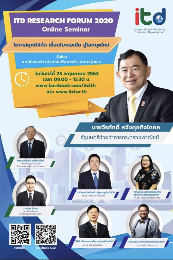 “วีรศักดิ์” สั่งการไอทีดีจัดสัมมนาเผยแพร่ผลงานวิจัย ITD Research Forum 2020 ในรูปแบบออนไลน์ เพื่อให้ผู้ประกอบการไทยปรับตัวรองรับการเปลี่ยนแปลง เพื่อก้าวสู่ยุคปกติใหม่ (New Normal) อย่างมีประสิทธิภาพ