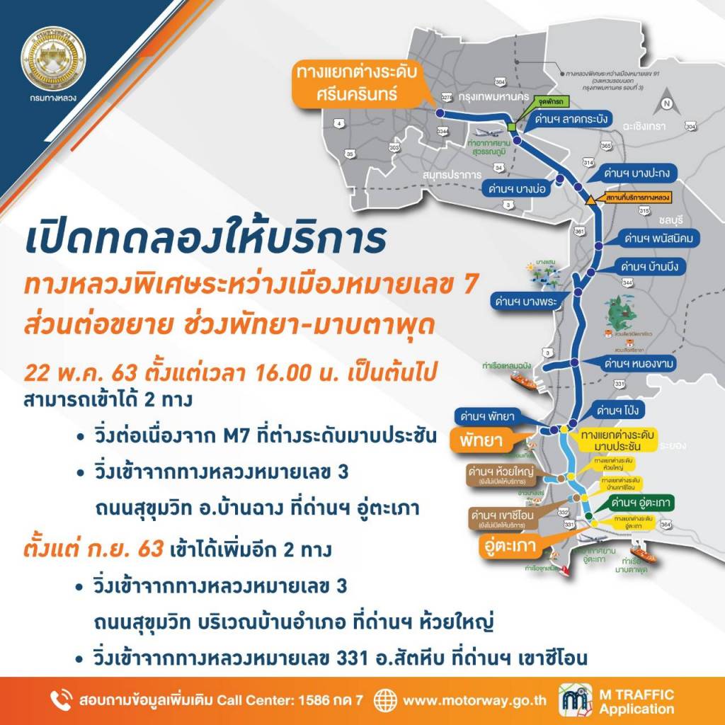 ในวันนี้ ทางหลวงพิเศษระหว่างเมืองหมายเลข 7 ส่วนต่อขยายช่วงพัทยา-มาบตาพุด พร้อมเปิดทดลองให้ประชาชนได้ใช้บริการแล้ว โดยผู้ใช้ทางสามารถเข้ามาใช้บริการได้ 2 ทาง คือ วิ่งต่อเนื่องจากทางหลวงพิเศษระหว่างเมืองหมายเลข 7 ช่วงชลบุรี – พัทยา ที่บริเวณทางแยกต่างระดับมาบประชัน หรือเข้าจากทางหลวงหมายเลข 3 ถนนสุขุมวิท ที่ด่านอู่ตะเภา ตั้งแต่วันที่ 22 พฤษภาคม 2563 เวลา 16.00 น.เป็นต้นไป จนถึงสิ้นเดือนสิงหาคม 2563 โดยไม่เก็บค่าธรรมเนียมผ่านทาง ซึ่งแสดงถึงความสำเร็จของกระทรวงคมนาคม ในการผลักดันโครงการต่าง ๆ ให้แล้วเสร็จโดยเร็ว เพื่ออำนวยความสะดวกให้แก่ประชาชน