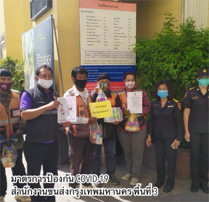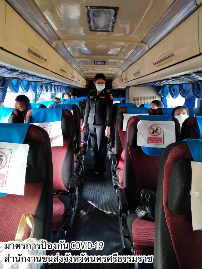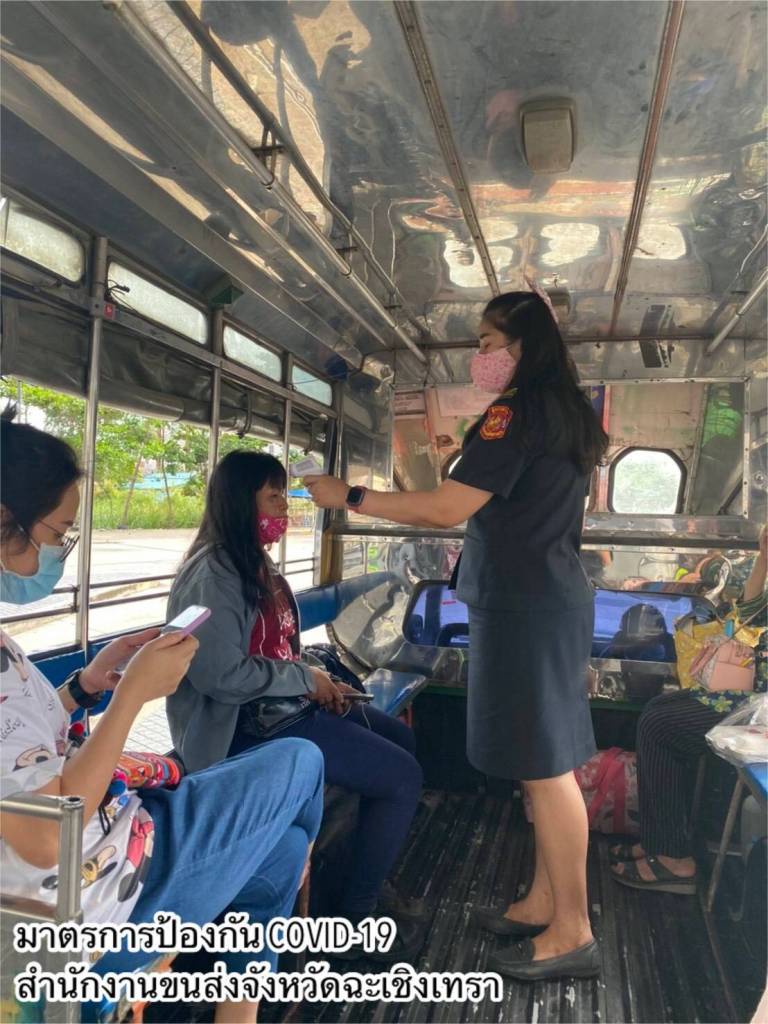 - ทำความสะอาดฆ่าเชื้อโรคพื้นที่ให้บริการภายในสำนักงานขนส่งทุกวัน โดยเฉพาะจุดที่มีการสัมผัสบ่อยครั้ง เช่น เคาน์เตอร์บริการ ที่จับประตู ที่จับราวบันได ปุ่มกดลิฟต์ เป็นต้น และจัดให้มีสบู่ในห้องน้ำ เจลแอลกอฮอล์ล้างมือที่เคาน์เตอร์ให้บริการและจุดประชาสัมพันธ์