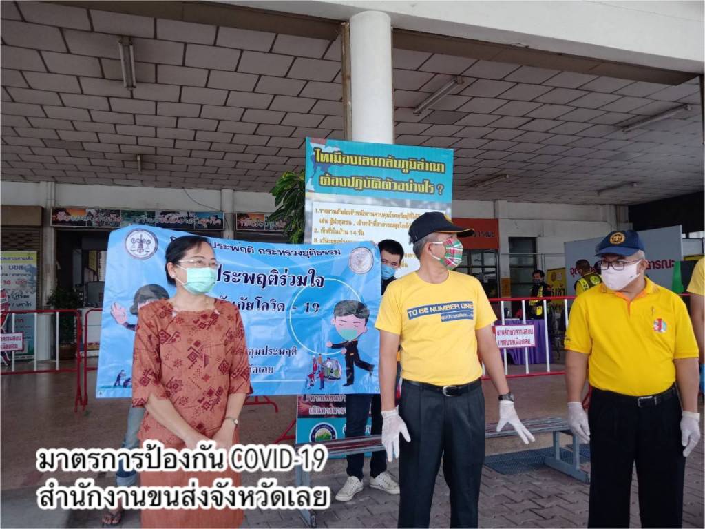 - ทำความสะอาดฆ่าเชื้อโรคพื้นที่ให้บริการภายในสำนักงานขนส่งทุกวัน โดยเฉพาะจุดที่มีการสัมผัสบ่อยครั้ง เช่น เคาน์เตอร์บริการ ที่จับประตู ที่จับราวบันได ปุ่มกดลิฟต์ เป็นต้น และจัดให้มีสบู่ในห้องน้ำ เจลแอลกอฮอล์ล้างมือที่เคาน์เตอร์ให้บริการและจุดประชาสัมพันธ์