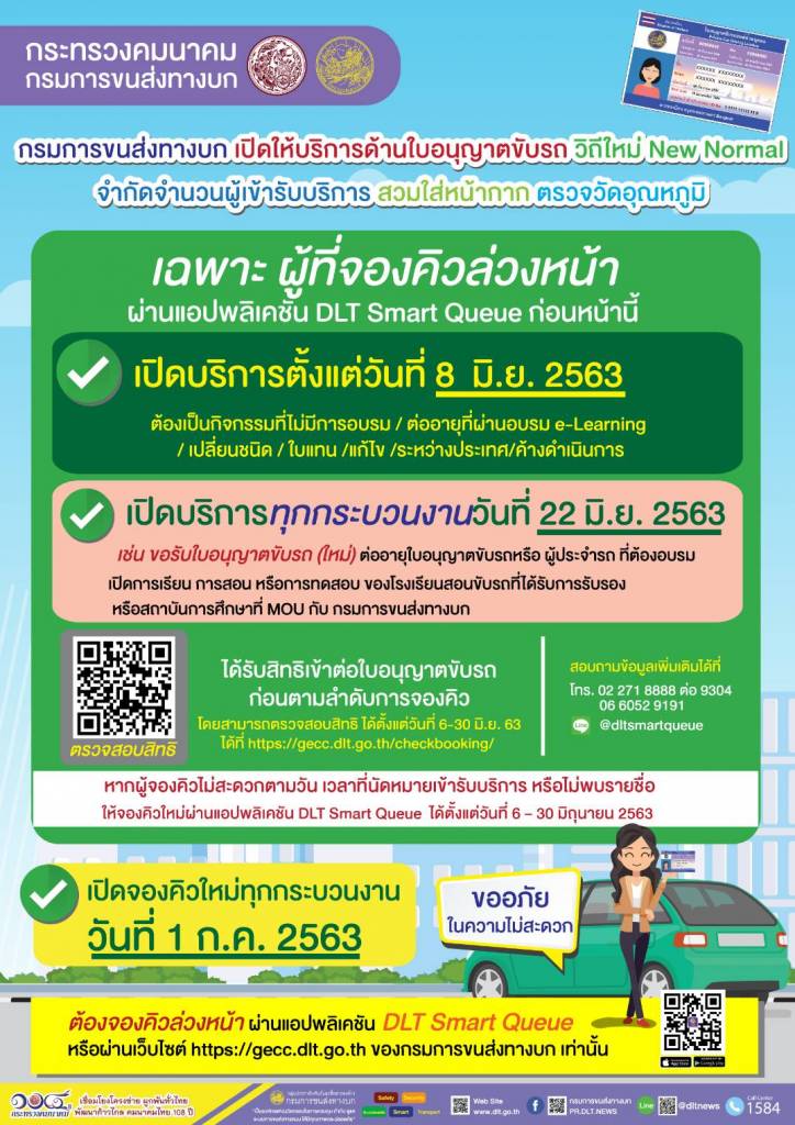 กรมการขนส่งทางบก เปิดให้บริการด้านใบอนุญาตขับรถวิถีใหม่ New Normal จำกัดจำนวนผู้เข้ารับบริการ ภายใต้มาตรการเว้นระยะห่างและความปลอดภัยทางด้านสาธารณสุข ให้สิทธิผู้จองคิวไว้แล้วดำเนินการก่อน ช่วงแรก เสี่ยงน้อยไม่มีการอบรมที่สำนักงาน เริ่ม 8 มิถุนายน 2563 ส่วนการขอใหม่ ขาดต่อเกิน 1 ปี โรงเรียนสอนขับรถ เริ่ม 22 มิถุนายน 2563 ย้ำ!!! ต้องจองคิวล่วงหน้าก่อนเข้ารับบริการเท่านั้น สำหรับผู้ที่เคยจองคิวไว้แล้วตรวจสอบสิทธิได้ตั้งแต่วันที่ 6 - 30 มิถุนายน 2563 ที่เว็บไซต์ https://gecc.dlt.go.th/checkbooking/ ตามข้อสั่งการของนายศักดิ์สยาม ชิดชอบ รัฐมนตรีว่าการกระทรวงคมนาคม