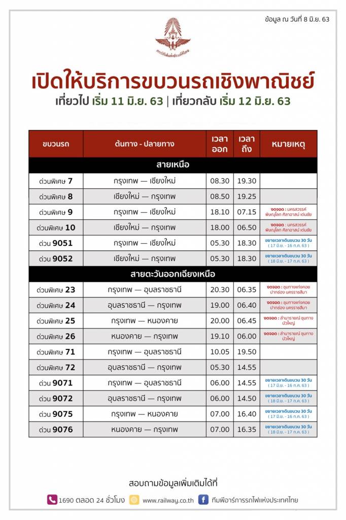 นายนิรุฒ มณีพันธ์ ผู้ว่าการรถไฟแห่งประเทศไทย แจ้งว่า ตามที่ศูนย์บริหารสถานการณ์การแพร่ระบาดของโรคติดเชื้อไวรัสโคโรนา 2019 (โควิด-19) หรือ ศบค. มีการผ่อนคลายการเดินทางข้ามเขตพื้นที่จังหวัด และให้ยานพาหนะ ผู้โดยสาร ตลอดจนผู้เกี่ยวข้องกับการขนส่งสาธารณะที่เป็นการขนส่งคนหรือสินค้าระหว่างจังหวัดที่เริ่มออกเดินทางจากจังหวัดต้นทาง ก่อนเวลา 23.00 น. และถึงจังหวัดปลายทางหลังเวลา 03.00 น. ของวันรุ่งขึ้น สามารถเดินทางข้ามเขตพื้นที่จังหวัดในช่วงเวลาห้ามออกนอกเคหะสถานได้ เพื่อลดผลกระทบต่อประชาชนด้านเศรษฐกิจ สังคม และความมั่นคงตามหลักเกณฑ์ขององค์การอนามัยโลกและตามผลการประเมินสถานการณ์ของฝ่ายสาธารณะสุข ทั้งนี้ คาดการณ์ว่าจะมีประชาชนมีความต้องการในการเดินทางมากขึ้น ดังนั้น เพื่อเป็นการอำนวยความสะดวกการเดินทางของประชาชนที่มีความจำเป็นต้องเดินทางโดยรถไฟ ทั้งการเดินทางภายในเขตเมือง ระหว่างเมือง และทางไกล ข้ามเขตพื้นที่จังหวัด การรถไฟฯ จึงได้ประกาศเปิดเดินขบวนรถโดยสารทางไกล ขบวนรถชานเมือง ขบวนรถธรรมดา และขบวนรถท้องถิ่น (เพิ่มเติม) จำนวน 108 ขบวน เพื่อให้สอดคล้องตามมาตรการผ่อนคลายการเดินทาง ระยะที่ 3 เริ่มให้บริการตั้งแต่วันที่ 11 มิถุนายน 2563 เป็นต้นไป จนกว่าจะมีคำสั่งเปลี่ยนแปลง สำหรับขบวนรถที่เปิดให้บริการในเส้นทางต่าง ๆ มีดังนี้
