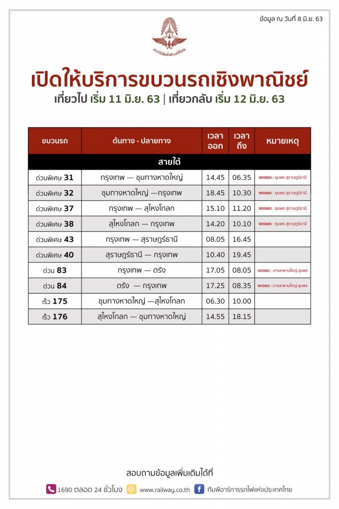 ตั้งแต่วันที่ 12 มิถุนายน 2563 (เที่ยวกลับ) จำนวน 5 ขบวน ประกอบด้วย ขบวนรถด่วนพิเศษที่ 32 (ชุมทางหาดใหญ่ - กรุงเทพ) ขบวนรถด่วนพิเศษที่ 38 (สุไหงโกลก - กรุงเทพ) และขบวนรถด่วนพิเศษ(ดีเซลราง)ที่ 40 (สุราษฎร์ธานี - กรุงเทพ) ขบวนรถด่วนที่ 84 (ตรัง - กรุงเทพ) และขบวนรถเร็วที่ 176 (สุไหงโก-ลก - ชุมทางหาดใหญ่) (**ขบวนรถที่ 32 และ 38 งดให้บริการรับ – ส่ง ผู้โดยสารที่ชุมพร และสุราษฎร์ธานี และขบวน 84 งดให้บริการรับ-ส่ง ผู้โดยสารที่ชุมพร และบางสะพานใหญ่ เนื่องจากยังอยู่ในช่วงเวลาเคอร์ฟิว**)