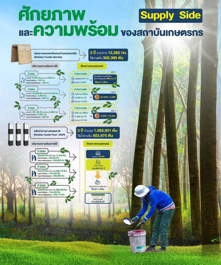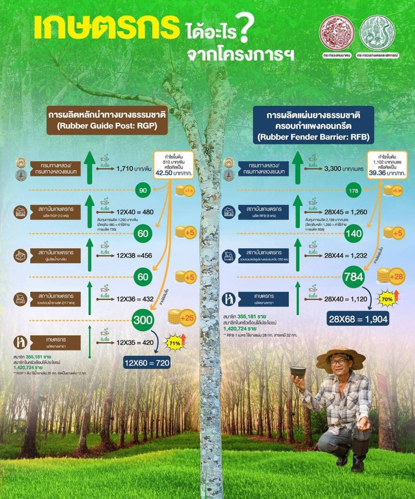 รัฐบาลโดย พลเอก ประยุทธ์ จันทร์โอชา มอบนโยบายให้กระทรวงคมนาคม ร่วมกับกระทรวงมหาดไทย กระทรวงเกษตร และสหกรณ์ และหน่วยงานที่เกี่ยวข้องปรับปรุงเส้นทางคมนาคมเพื่อลดการบาดเจ็บสาหัส และเสียชีวิตจากอุบัติเหตุบนทางหลวง ขณะเดียวกันเพื่อช่วยเหลือเกษตรกรชาวสวนยางที่ประสบปัญหาราคายางตกต่ำ จึงได้มุ่งเน้นให้ใช้น้ำยางพาราเป็นวัสดุในการปรับปรุง ก่อสร้างทาง เพื่อสร้างรายได้ให้เกษตรกรโดยตรง กระทรวงคมนาคม โดย กรมทางหลวง และกรมทางหลวงชนบท จึงได้ร่วมกับมหาวิทยาลัยสงขลานครินทร์ และสถาบันวิจัยวิทยาศาสตร์ และเทคโนโลยีแห่งประเทศไทย ศึกษาแนวทางการเพิ่มความปลอดภัยทางถนนด้วยการใช้ยางพาราเป็นวัสดุหลัก ซึ่งจากผลการศึกษา และวิจัยพบว่า มี 2 ผลิตภัณฑ์ที่เหมาะสม คือ แผ่นยางธรรมชาติครอบกำแพงคอนกรีต (Rubber Fender Barrier : RFB) และหลักนำทางยางธรรมชาติ (Rubber Guide Post : RGP) ซึ่งได้รับการทดสอบการชนจากสถาบันวิจัยวิทยาศาสตร์และเทคโนโลยีแห่งประเทศไทย และสถาบัน Korea Automobile Testing & Research Institute (KATRI) ประเทศสาธารณรัฐเกาหลี พบว่าสามารถลดความรุนแรงของอุบัติเหตุได้อย่างมีประสิทธิภาพ โดยกระทรวงคมนาคมมีแผนดำเนินงานนำผลิตภัณฑ์ทั้ง 2 อย่าง มาใช้ติดตั้งบนถนนของกรมทางหลวง และกรมทางหลวงชนบททั่วประเทศ ภายในปี 2563 - 2565 แบ่งเป็นแผ่นยางธรรมชาติครอบกำแพงคอนกรีต (RFB) ระยะทางรวม 12,282 กิโลเมตร และหลักนำทางยางธรรมชาติ (RGP) จำนวน 1,063,651 ต้น ใช้น้ำยางพาราในปริมาณมากถึง 1 ล้านตัน สร้างรายได้ให้เกษตรกรถึง 71% หรือคิดเป็นผลตอบแทนกว่า 30,000 ล้านบาท ซึ่งเกษตรกรจะได้รับโดยตรง เป็นการยกระดับรายได้ และคุณภาพชีวิตของเกษตรกรไทย ทั้งนี้ กระทรวงเกษตรและสหกรณ์พร้อมให้การสนับสนุนเครื่องมือรวมถึงวัตถุดิบในการผลิตโดยให้สหกรณ์สวนยางทั่วประเทศที่มีคุณสมบัติเหมาะสมเข้าร่วมโครงการ ให้ได้รับการถ่ายทอดเทคโนโลยีการผลิตจากกระทรวงคมนาคม และสามารถกระจายรายได้สู่เกษตรกรอย่างเท่าเทียม จึงนำมาสู่การทำบันทึกความร่วมมือการนำอุปกรณ์ทางด้านการจราจร และอำนวยความปลอดภัยทางถนนที่ผลิตจากยางพาราไปใช้ประโยชน์ในหน่วยงานภาครัฐ ระหว่างกระทรวงคมนาคม และกระทรวงเกษตรและสหกรณ์