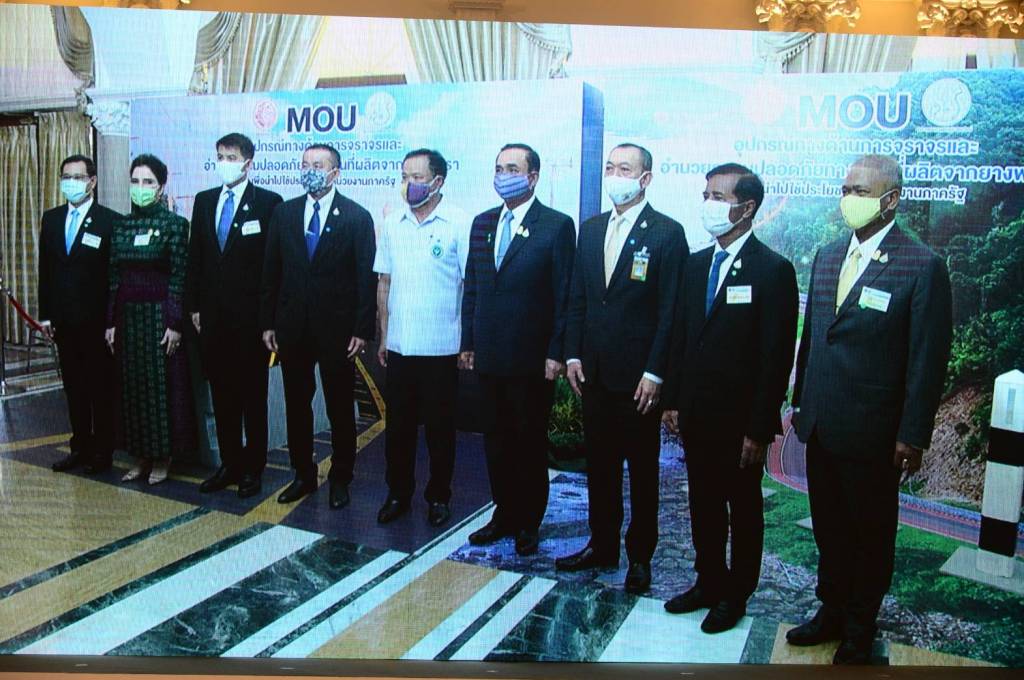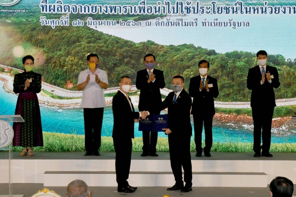 เมื่อวันที่ 12 มิถุนายน 2563 พลเอก ประยุทธ์ จันทร์โอชา นายกรัฐมนตรี เป็นประธานในพิธีลงนามความร่วมมือการนำอุปกรณ์ทางด้านการจราจร และอำนวยความปลอดภัยทางถนน ที่ผลิตจากยางพาราไปใช้ประโยชน์ในหน่วยงานภาครัฐ ระหว่างกระทรวงคมนาคม โดยนายศักดิ์สยาม ชิดชอบ รัฐมนตรีว่าการกระทรวงคมนาคม และ กระทรวงเกษตร และสหกรณ์ โดยนายเฉลิมชัย ศรีอ่อน รัฐมนตรีว่าการกระทรวงเกษตร และสหกรณ์ เป็นผู้แทนลงนาม และ มีนายถาวร เสนเนียม รัฐมนตรีช่วยว่าการกระทรวงคมนาคม, นางสาวมนัญญา ไทยเศรษฐ์ รัฐมนตรีช่วยว่าการกระทรวงเกษตร และสหกรณ์, นายชัยวัฒน์ ทองคำคูณ ปลัดกระทรวงคมนาคม และนายอนันต์ สุวรรณรัฐ ปลัดกระทรวงเกษตร และสหกรณ์ ร่วมเป็นสักขีพยาน พร้อมด้วย นายอนุทิน ชาญวีรกูล รองนายกรัฐมนตรี และรัฐมนตรีว่าการกระทรวงสาธารณสุข, นายอธิรัฐ รัตนเศรษฐ รัฐมนตรีช่วยว่าการกระทรวงคมนาคม, นายพิศักดิ์ จิตวิริยะวศิน รองปลัดกระทรวงคมนาคม, นายสราวุธ ทรงศิวิไล อธิบดีกรมทางหลวง, นายปฐม เฉลยวาเรศ อธิบดีกรมทางหลวงชนบท, นายพิเชษฐ์ วิริยะพาหะ อธิบดีกรมส่งเสริมสหกรณ์ และนายเข้มแข็ง ยุติธรรมดำรง อธิบดีกรมส่งเสริมการเกษตร ศ.ดร.นฤมล ภิญโญสินวัฒน์ โฆษกประจำสำนักนายกรัฐมนตรี และ นางสาวไตรศุลี ไตรสรณกุล รองโฆษกประจำสำนักนายกรัฐมนตรี ร่วมเป็นเกียรติในพิธีฯ ณ ทำเนียบรัฐบาล