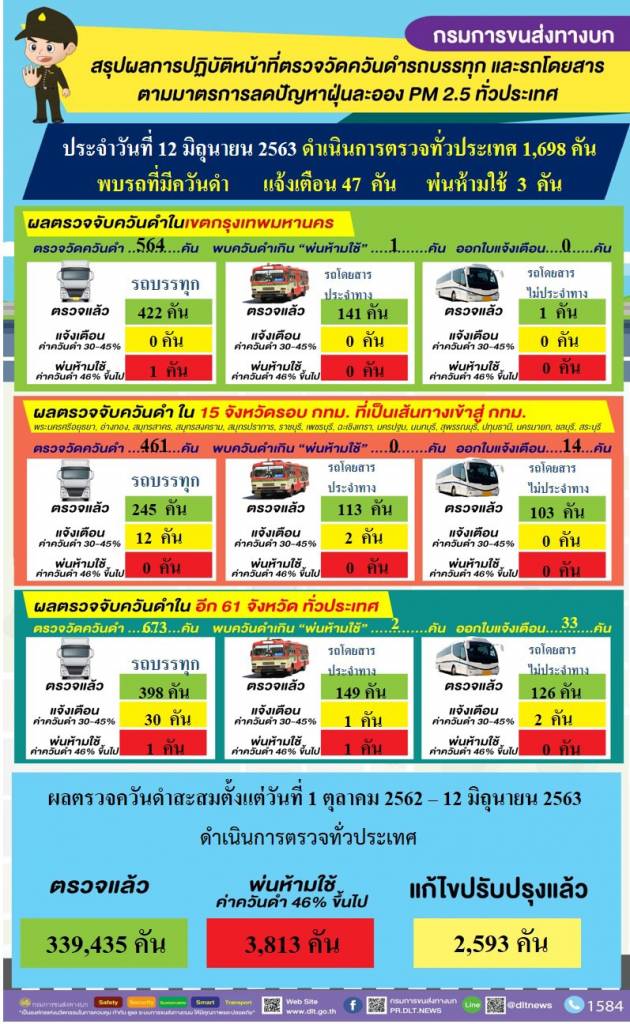 ด้าน นายจิรุตม์ วิศาลจิตร อธิบดีกรมการขนส่งทางบก เผยผลการดำเนินการ วันที่ 12 มิถุนายน 2563 ดำเนินการตรวจวัดควันดำรถโดยสารและรถบรรทุก จำนวน 1,689 คัน พบรถที่มีค่าควันดำเกิน จำนวน 3 คัน ส่วนรถที่มีค่าควันดำ 30 - 45 % ได้ออกใบเตือน จำนวน 47 คัน เพื่อให้ผู้ประกอบการไปบำรุงดูแลรักษารถไม่ให้มีค่าควันดำเกิน แบ่งเป็น ดังนี้