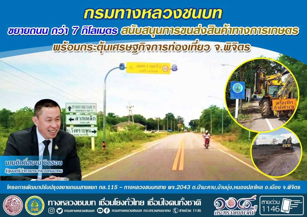 นายปฐม เฉลยวาเรศ อธิบดีกรมทางหลวงชนบท เปิดเผยว่า จังหวัดพิจิตร ถือเป็นแหล่งพื้นที่ทางการเกษตรที่สำคัญ โดยเฉพาะพื้นที่ 3 ตำบล ได้แก่ ตำบลป่ามะคาบ ตำบลบ้านบุ่ง และตำบลหนองปลาไหล ที่มีการเพาะปลูกผลผลิตทางการเกษตรที่สำคัญ อาทิ ข้าว แตงโม มะม่วง มะปราง มะยงชิด ฯลฯ นอกจากนี้ ยังมีแหล่งท่องเที่ยวที่สำคัญ ได้แก่ พิพิธภัณฑ์บ้านดงโฮจิมินห์ สัญลักษณ์แห่งมิตรภาพไทย – เวียดนาม ตัวอย่างของพิพิธภัณฑ์การเรียนรู้แห่งชาติของไทย ซึ่งถือเป็นแหล่งท่องเที่ยวเชิงอนุรักษ์แบบชุมชน ของตำบลป่ามะคาบ และยังมีแหล่งผลิตสินค้า ซึ่งถือเป็นต้นตำหรับของฝากจากโรงงาน OTOP 4 ดาว อาทิ โรงงานข้าวเกรียบกุ้งชาละวัน ทั้งนี้ เพื่อให้การขนส่งสินค้าพืชผล ผลิตภัณฑ์ทางการเกษตรเข้าสู่ตลาด ได้อย่างสะดวกรวดเร็ว และปลอดภัย ทช. จึงได้ขยายถนนบริเวณสายแยกทางหลวงแผ่นดินหมายเลข 115 ถึง ทางหลวงชนบทสาย พจ.2043 ตำบลป่ามะคาบ, ตำบลบ้านบุ่ง อำเภอเมือง และตำบลหนองปลาไหล อำเภอวังทรายพูน จังหวัดพิจิตร โดยมีจุดเริ่มต้นที่ทางหลวงแผ่นดินหมายเลข 115 กม.ที่ 0+000 ถึง กม.ที่ 4+367 ระยะทาง 4.367 กิโลเมตร โดยขยายผิวจราจร จากเดิม 4 เมตร เป็น 6 เมตร ตั้งแต่ กม.ที่ 4+367 ถึง กม.ที่ 6+700 ระยะทาง 2.333 กิโลเมตร และซ่อมสร้างผิวทาง จราจร 6 เมตร ตั้งแต่ กม.ที่ 6+700 ถึง กม.ที่ 7+689 ระยะทาง 0.989 กิโลเมตร พร้อมติดตั้งไฟฟ้าแสงสว่าง รวมระยะทางดำเนินการทั้งสิ้น 7.689 กิโลเมตร