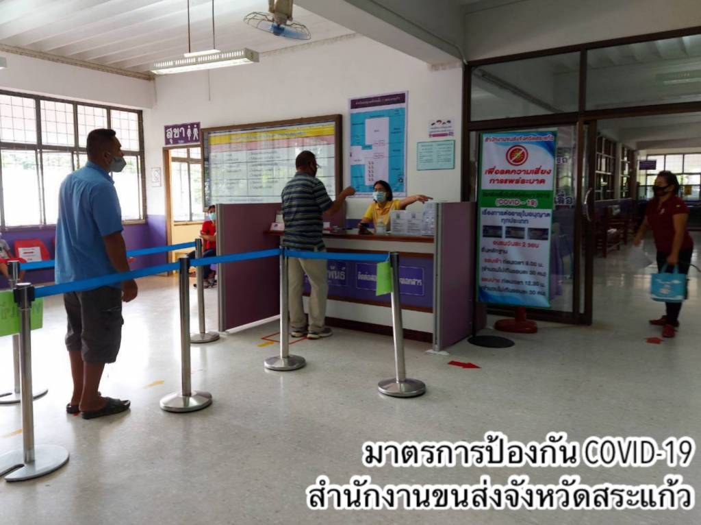 •ดำเนินการตามมาตรการ Social Distancing โดยเว้นระยะห่างของที่นั่งพักคอยของประชาชน กำหนดระยะห่างของตำแหน่งการยืนคอยรับบริการ ติดตั้ง Table Shield กั้นระหว่างผู้มาติดต่อกับเจ้าหน้าที่
