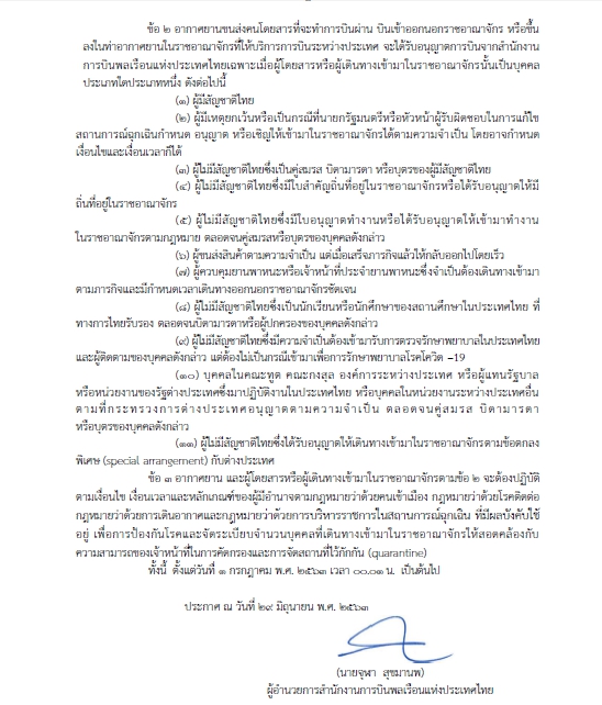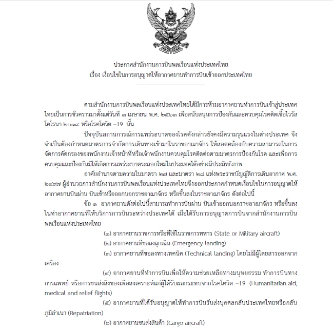 ตามที่สำนักงานการบินพลเรือนแห่งประเทศไทย ได้มีการห้ามอากาศยานทำการบินเข้าสู่ประเทศ ไทยเป็นการชั่วคราวมาตั้งแต่วันที่ 3 เมษายน พ.ศ. 2563 เพื่อสนับสนุนการป้องกันและควบคุมโรคติดเชื้อไวรัส โคโรนา 2019 หรือโรคโควิด –19 นั้น ปัจจุบันสถานการณ์การแพร่ระบาดของโรคดังกล่าวยังคงมีความรุนแรงในต่างประเทศ จึงจำเป็นต้องกำหนดมาตรการจำกัดการเดินทางเข้ามาในราชอาณาจักร ให้สอดคล้องกับความสามารถในการจัดการคัดกรองของพนักงานเจ้าหน้าที่ หรือเจ้าพนักงานควบคุมโรคติดต่อตามมาตรการป้องกันโรค และเพื่อการ ควบคุมและป้องกันมิให้เกิดการแพร่ระบาดระลอกใหม่ในประเทศได้อย่างมีประสิทธิภาพ อาศัยอำนาจตามความในมาตรา 27 และมาตรา 28 แห่งพระราชบัญญัติการเดินอากาศ พ.ศ. 2497 ผู้อำนวยการสำนักงานการบินพลเรือนแห่งประเทศไทยจึงออกประกาศกำหนดเงื่อนไขในการอนุญาตให้ อากาศยานบินผ่าน บินเข้าหรือออกนอกราชอาณาจักร หรือขึ้นลงในราชอาณาจักร ดังต่อไปนี้