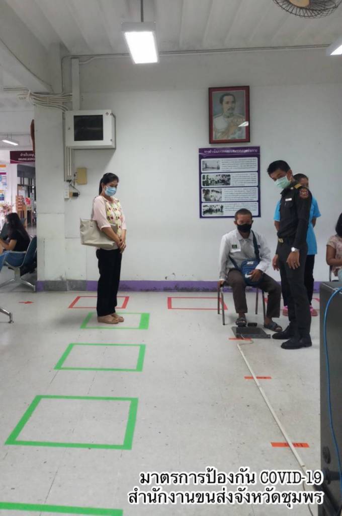 •ดำเนินการตามมาตรการ Social Distancing โดยเว้นระยะห่างของที่นั่งพักคอยของประชาชน กำหนดระยะห่างของตำแหน่งการยืนคอยรับบริการ ติดตั้ง Table Shield กั้นระหว่างผู้มาติดต่อกับเจ้าหน้าที่