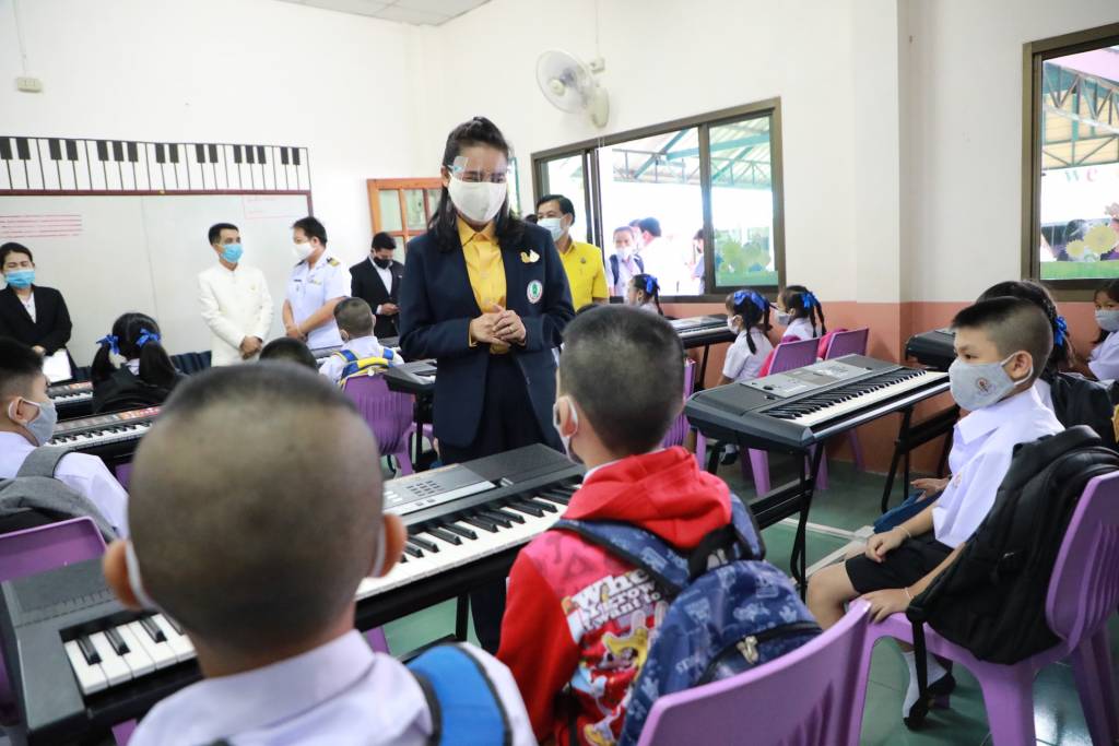 และในโอกาสนี้ รมช.ศึกษาธิการ เยี่ยมชมห้องเรียนโครงการสอนดนตรีสากลในโรงเรียนสามัญ หลักสูตร YAMAHA MUSIC STEP ที่เน้นการสอนแบบบูรณาการด้านการเรียนรู้ทักษะทางดนตรี รวมทั้งจัดการเรียนแบบกลุ่ม เสริมประสบการณ์ดนตรีร่วมกับเพื่อนในชั้นเรียน ที่จะสร้างประสบการณ์ในการทำงานร่วมกัน การเข้าสังคม และมีความเข้าใจในความแตกต่าง เอกลักษณ์ของเพื่อนแต่ละคน ถือเป็นการพัฒนาทักษะการอยู่ร่วมกันในสังคม (Soft Skills) ได้ความรู้ สร้างความสนุกสนาน และสอดแทรกทักษะการใช้ชีวิตอย่างสมดุลกลมกลืน ที่น่าชื่นชม และพร้อมกันนี้ รมช.ศึกษาธิการ ได้มอบหน้ากากอนามัยแบบผ้าจากน้ำใจชาว กศน. 300 ชิ้น สำหรับใช้ในโรงเรียนแห่งนี้ด้วย