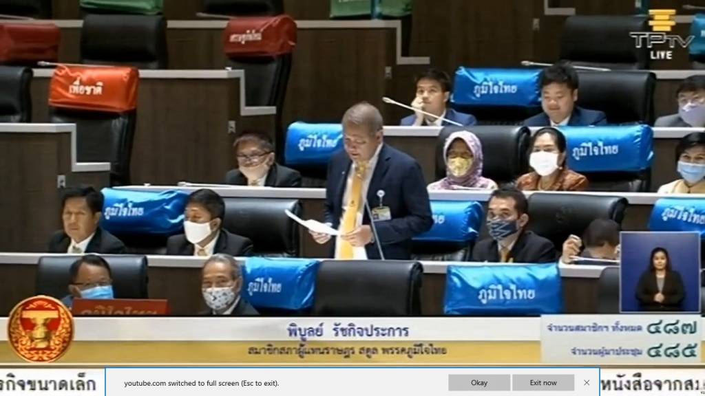 เมื่อวันที่ 3 กรกฎาคม 2563 นายพิบูลย์ รัชกิจประการ สมาชิกสภาผู้แทนราษฎร พรรคภูมิใจไทย เขต 1 จังหวัดสตูล กล่าวอภิปรายในสภา ถึงร่าง พ.ร.บ.งบประมาณรายจ่ายประจำปีงบประมาณ 2564 ในที่ประชุมสภาว่า จากสถานวิกฤตโควิด-19 ทำให้ประเทศไทย และต่างประเทศทั่วโลกเกิดปัญหากับชีวิต และทรัพย์สินของประชาชน ทำให้เศรษฐกิจตกต่ำ เช่นเดียวกันประเทศไทย ซึ่งส่วนใหญ่มีอาชีพทำการเกษตร ซึ่งได้รับผลกระทบทางด้านเกษตร มีปัญหาด้านราคาสินค้าเกษตร อาทิ ปาล์มน้ำมัน ยางพารา อ้อย มันสำปะหลัง จริง ๆ แล้วราคาผลผลิตการเกษตรถ้ายังหวังพึ่งการส่งออกจะทำให้ราคาไม่เสถียร ถ้าปลูกเองผลิตเองแปรรูป และขายเอง เราก็อยู่ได้ เช่นเดียวกับยางพารา ถ้าเรายังคิดว่าหวังพึ่งส่งออกอย่างเดียว ไม่แปรรูป ไม่เปลี่ยนแปลง หรือทำอะไร ก็ทำให้ราคาไม่เสถียร