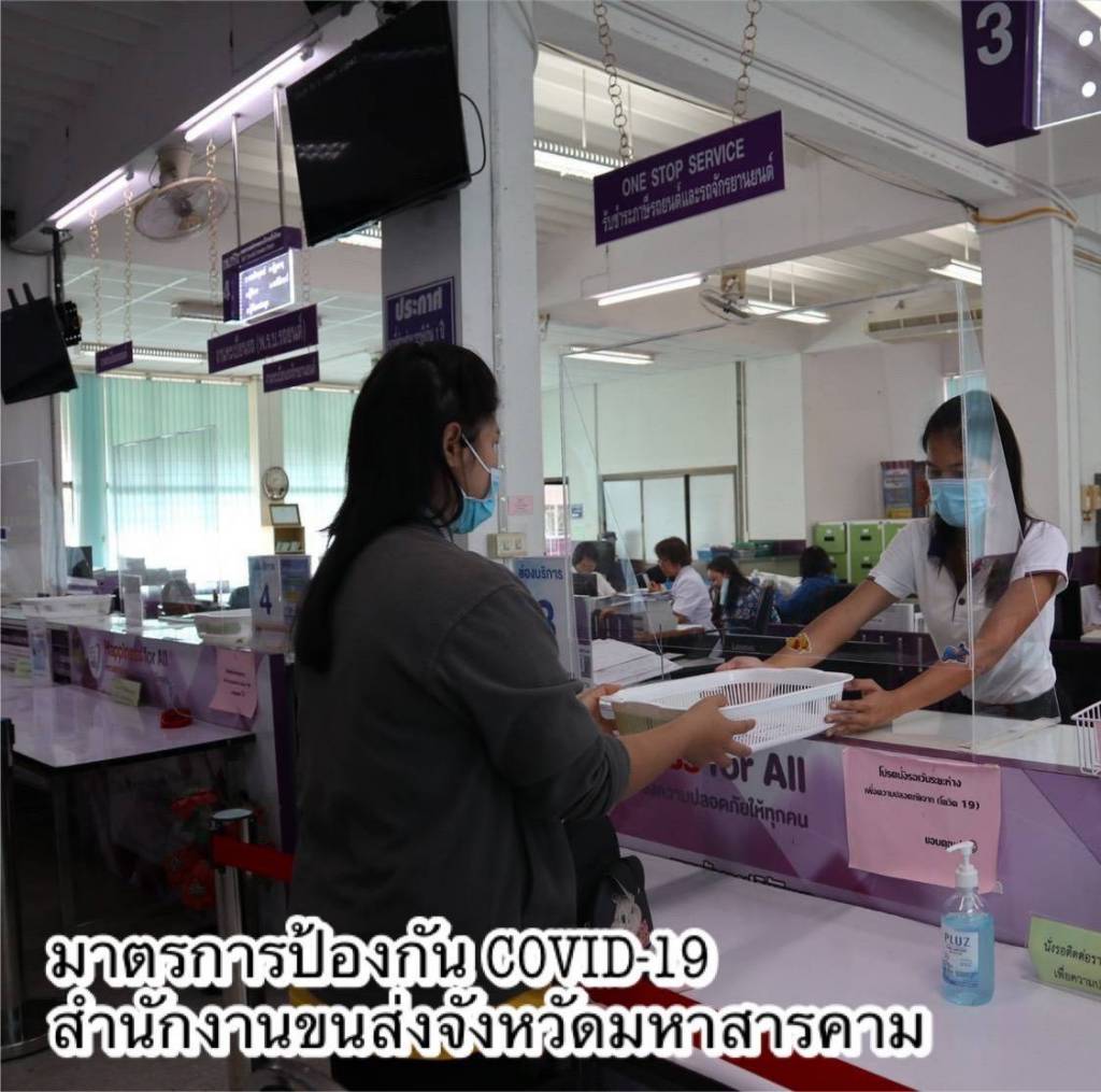•ดำเนินการตามมาตรการ Social Distancing โดยเว้นระยะห่างของที่นั่งพักคอยของประชาชน กำหนดระยะห่างของตำแหน่งการยืนคอยรับบริการ ติดตั้ง Table Shield กั้นระหว่างผู้มาติดต่อกับเจ้าหน้าที่