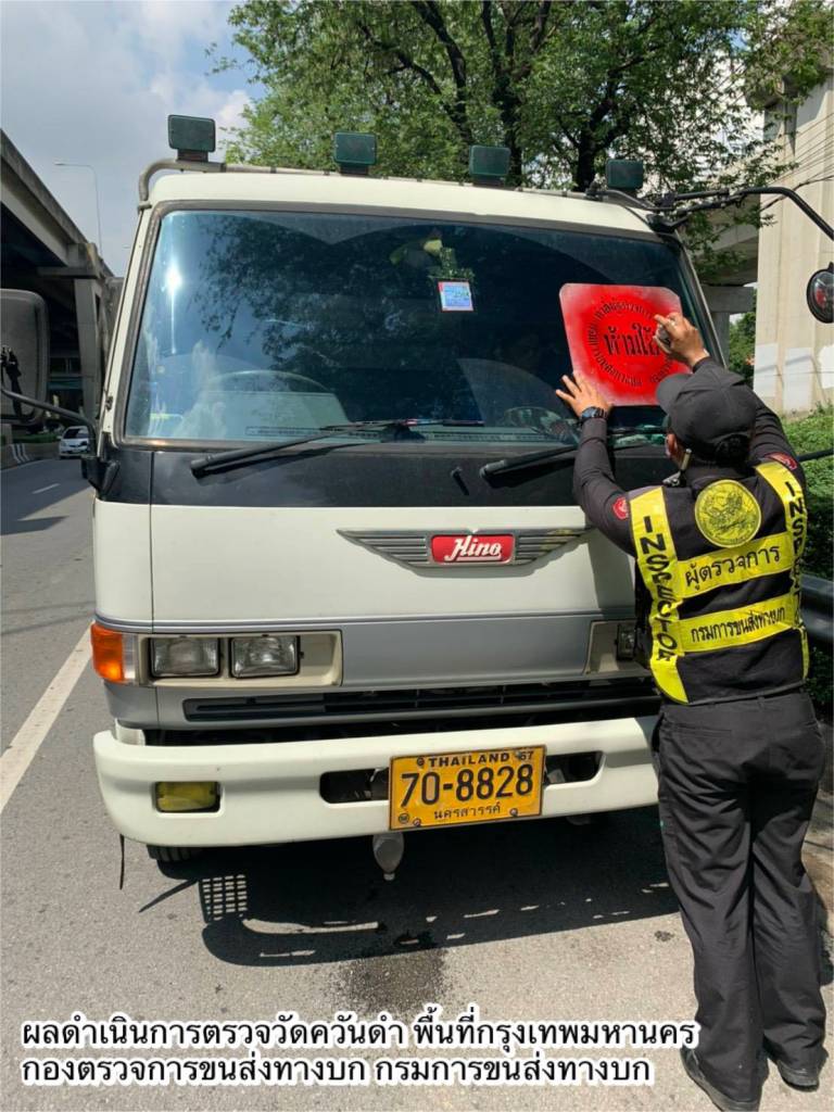 ในเขตกรุงเทพมหานคร ดำเนินการตรวจในพื้นที่ที่มีค่าฝุ่นละอองขนาดเล็ก PM2.5 สูง ตรวจวัดค่าควันดำรถจำนวน 501 คัน (รถบรรทุก 367 คัน,รถโดยสารประจำทาง 132 คัน,รถโดยสารไม่ประจำทาง 2 คัน) พบรถที่มีค่าควันดำเกินเกณฑ์มาตรฐานที่ราชการกำหนด จำนวน 1 คัน และออกใบเตือน จำนวน 1 คัน