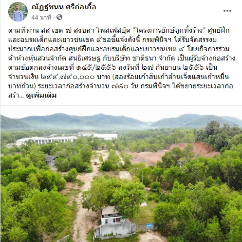 " ตามที่ท่าน ส.ส. เขต ๗ สงขลา โพสเฟซบุ๊ก “โครงการยักษ์ถูกทิ้งร้าง” ศูนย์ฝึกและอบรมเด็กและเยาวชนเขต ๙ขอชี้แจ้งดังนี้ กรมพินิจฯ ได้รับจัดสรรงบประมาณเพื่อก่อสร้างศูนย์ฝึกและอบรมเด็กและเยาวชนเขต ๙ โดยกิจการร่วมค้าห้างหุ้นส่วนจำกัด สนธิเศรษฐ กับบริษัท ชาติธนา จำกัด เป็นผู้รับจ้างก่อสร้าง ตามข้อตกลงจ้างเลขที่ ๑๔๕/๒๕๕๖ ลงวันที่ ๒๗ กันยายน ๒๕๕๖ เป็นจำนวนเงิน ๒๙๙,๗๙๐,๐๐๐ บาท (สองร้อยเก้าสิบเก้าล้านเจ็ดแสนเก้าหมื่นบาทถ้วน) ระยะเวลาก่อสร้างจำนวน ๗๘๐ วัน กรมพินิจฯ ได้ขยายระยะเวลาก่อสร้างทั้งสิ้น ๒ ครั้ง รวม ๔๘๐ วัน สิ้นสุดสัญญาจ้างวันที่ ๑๐ มีนาคม ๒๕๖๐ และกรมพินิจฯ ได้บอกเลิกสัญญาจ้างเมื่อวันที่ ๑๓ กันยายน ๒๕๖๐ เนื่องจากผู้รับจ้างไม่สามารถปฏิบัติงานให้แล้วเสร็จตามข้อตกลงจ้างได้ ภายหลังข้อตกลงจ้างสิ้นสุด กรมพินิจฯ ได้ดำเนินการ ดังนี้
