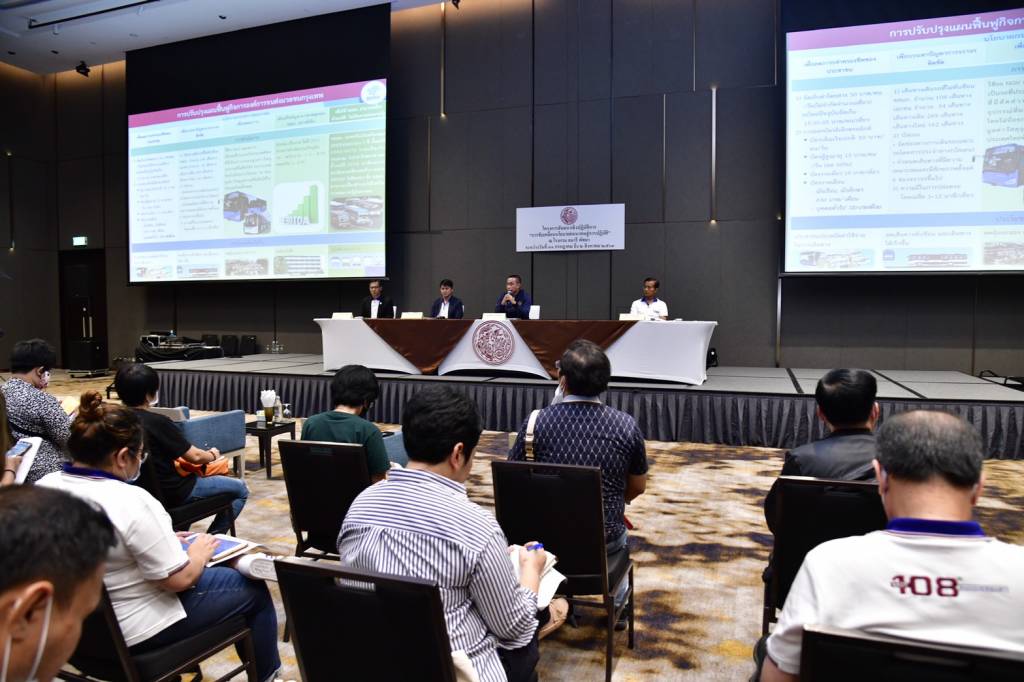 2. กลุ่มการขนส่งทางบก โดยมี ขบ. (หัวหน้ากลุ่ม) ขสมก. บขส. สนข. ได้ระดมความคิดเห็นเกี่ยวกับผลการดำเนินงานด้านโครงสร้างพื้นฐาน และระบบโลจิสติกส์ ด้านการขนส่งสินค้า มุ่งเน้นการขับเคลื่อนเป้าหมายการพัฒนาระบบการขนส่งทางถนนของประเทศตามแผนย่อยโครงสร้างพื้นฐานด้านคมนาคม และระบบโลจิสติกส์เพื่อการลดต้นทุนการขนส่งสินค้า การพัฒนาเศรษฐกิจพิเศษชายแดน แผนงานที่จะดำเนินการในปี 2564 – 2565 ที่สำคัญ คือ โครงการศึกษาบูรณาการแบบการพัฒนาสถานีเปลี่ยนถ่าย และกระจายสินค้าของประเทศ เชื่อมต่อการขนส่งหลายรูปแบบ เพื่อขยายสถานีขนส่งสินค้าชานเมือง ด้านการขนส่งผู้โดยสาร การเปลี่ยนรถตู้เป็นรถมินิบัส โดย ขบ. ได้มีการศึกษาทั้งด้านความปลอดภัย และความคุ้มค่า และรับฟังความคิดเห็นจากทุกภาคส่วนที่เกี่ยวข้อง เห็นควรให้รถตู้โดยสารมีอายุไม่เกิน 10 ปี สำหรับรถโดยสารประจำทางสายยาว และระหว่างจังหวัด (หมวด 2 หมวด 3) ส่วนการเปลี่ยนรถตู้เป็นรถมินิบัสในเมือง (หมวด 1 หมวด 4) เป็นภาคสมัครใจ ยกระดับการใช้บริการรถแท็กซี่เพื่อไปสู่การเป็น Smart Taxi โครงการยกระดับ Smart Bus Terminal เพื่ออำนวยความสะดวกกับผู้ใช้บริการรถโดยสารสาธารณะ การบริการรถโดยสารเชื่อมต่อระบบ Feeder Services และการส่งเสริมการท่องเที่ยวเชิงคุณภาพ ด้านการความปลอดภัย ได้ขับเคลื่อนการดำเนินงานโดยมีเป้าหมายในการลดจำนวนผู้เสียชีวิตจากอุบัติเหตุทางถนน โดยจัดให้มีผู้จัดการความปลอดภัยด้านการขนส่งทางถนน (Transport Safety Manager) มาตรการ Check คน Check รถ Checking Point ต่อยอดระบบ GPS ในรถสาธารณะ และรถบรรทุกขนาดใหญ่ และการพัฒนาศูนย์ขับรถจำลอง (Bus Simulator) ของ บขส. ผลงานด้านการเสริมสร้างความยั่งยืนของประเทศ เป้าหมายการพัฒนาที่สำคัญเพื่อนำไปสู่การเป็นสังคมที่เป็นมิตรต่อสภาพภูมิอากาศ การลดปัญหาฝุ่นละออง PM 2.5 ยกระดับสถานตรวจสภาพรถของรัฐ และเอกชน การปรับปรุงคุณภาพมาตรฐานเครื่องยนต์ การส่งเสริมการเดินทางด้วยรถสาธารณะมาตรการด้านภาษีประจำปีสำหรับยานยนต์ไฟฟ้า และมาตรการส่งเสริมการใช้รถยนต์ไฟฟ้า ผลงานการเป็นรัฐบาลดิจิทัล หน่วยงานได้พัฒนาระบบการกำกับดูแล และพัฒนาการให้บริการประชาชนโดยใช้ระบบเทคโนโลยีสารสนเทศ สู่การเป็นรัฐบาลดิจิทัลตามนโยบายรัฐบาล และเป็นการดำเนินการรูปแบบใหม่ (New Normal) โดยมีการอบรมผ่านระบบ e-learning สำหรับผู้ขอต่ออายุใบอนุญาตขับรถ และการจองคิวการดำเนินการผ่าน DLT Smart Queue การแสดงใบอนุญาตขับรถได้เสมือนจริง (DLT QR LICENCE) รวมทั้งได้มีการพัฒนาการชำระภาษีรถประจำปีผ่านโทรศัพท์เคลื่อนที่ด้วยแอปพลิเคชัน DLT Vehicle Tax การพัฒนาระบบ e-Service การพัฒนาระบบส