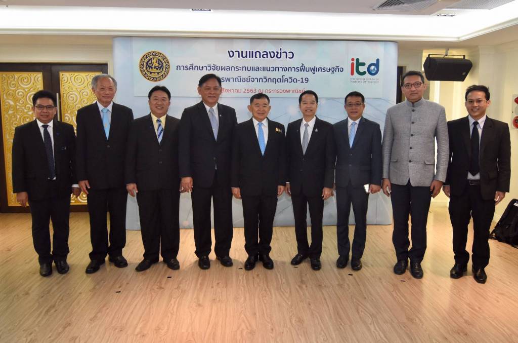 เมื่อวันที่ 7 สิงหาคม 2563 นายวีรศักดิ์ หวังศุภกิจโกศล รัฐมนตรีช่วยว่าการกระทรวงพาณิชย์ เปิดเผยหลังจากเป็นประธานเปิดการแถลงข่าว “การศึกษาวิจัยผลกระทบ และแนวทางการฟื้นฟูเศรษฐกิจการพาณิชย์จากวิกฤตโควิด-19” ว่าได้มอบหมายให้ไอทีดีทำการศึกษาวิจัยเกี่ยวกับผลกระทบจากปัญหา อุปสรรค และโอกาสจากวิกฤตโควิด-19 ที่มีต่อเศรษฐกิจของประเทศไทย โดยให้มุ่งเน้นศึกษาวิเคราะห์ และประเมินผลกระทบที่มีต่อภาคเกษตร อุตสาหกรรม และการท่องเที่ยว เนื่องจากได้เล็งเห็นถึงความจำเป็นเร่งด่วนในการฟื้นฟูภาคเศรษฐกิจการพาณิชย์ของประเทศ ซึ่งจำเป็นต้องใช้มาตรการที่ช่วยแก้ปัญหาได้ตรงกับความต้องการของผู้ประกอบการอย่างแท้จริง โดยเฉพาะกลุ่มสินค้าและบริการที่มีศักยภาพของไทย เช่น ข้าว ผลไม้ต่าง ๆ อาหารสำเร็จรูป ไก่ อาหารทะเล และภาคบริการ เช่น ร้านอาหาร แฟรนไชส์ โลจิสติกส์ และดิจิทัลคอนเทนท์ ฯลฯ