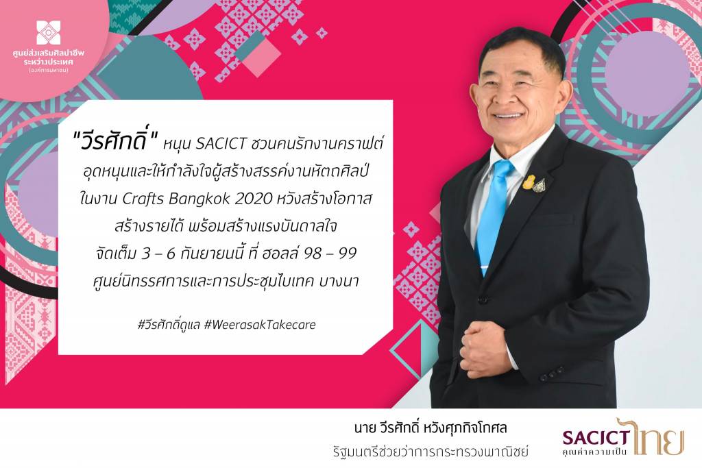 นายวีรศักดิ์ หวังศุภกิจโกศล รัฐมนตรีช่วยว่าการกระทรวงพาณิชย์ กล่าวว่าในช่วงเดือนสิงหาคม 2563 ที่ผ่านมา SACICT ประสบความสำเร็จในการจัดงาน “ศิลปาชีพทอใจ วิถีใหม่ใต้ร่มพระบารมี” จนมียอดขายภายในงานทะลุเป้าถึง 71 ล้านบาท และ เพื่อเป็นการกระตุ้นกำลังซื้อ และช่วยเหลือผู้ประกอบการหัตถศิลป์ทั่วประเทศ ก่อเกิดการกระจายรายได้ไปยังชาวบ้าน สมาชิกศิลปาชีพและชุมชนในท้องถิ่นต่าง ๆ อันจะเป็นการขับเคลื่อนเศรษฐกิจฐานรากอย่างต่อเนื่องภายหลังสถานการณ์ไวรัสโควิด-19 SACICT จึงเตรียมจัดงาน “Crafts Bangkok 2020” ซึ่งเป็นงานที่จัดขึ้นต่อเนื่องทุกปี ปีนี้เป็นปีที่ 3 เพื่อมุ่งหวังให้วงการหัตถกรรมไทยเกิดการพัฒนา ยกระดับคุณภาพการผลิต ทักษะกระบวนการความคิดสร้างสรรค์ในการออกแบบผลิตภัณฑ์ รวมทั้งการนำนวัตกรรมและแรงบันดาลใจใหม่ ๆ เข้ามาต่อยอด เพื่อให้งานหัตถกรรมไทยเกิดการปรับตัวรองรับการเปลี่ยนแปลงของโลก ผลิตภัณฑ์สามารถนำมาใช้ได้จริง ในชีวิตประจำวัน สอดรับกับวิถีชีวิตใหม่ในยุคปัจจุบัน อีกทั้งยังเป็นการเพิ่มขีดความสามารถในการแข่งขัน ให้ผู้ประกอบการหัตถศิลป์ของไทย ให้เกิดศักยภาพอย่างรอบด้านที่จะแข่งขันในตลาดทั้งในและต่างประเทศได้