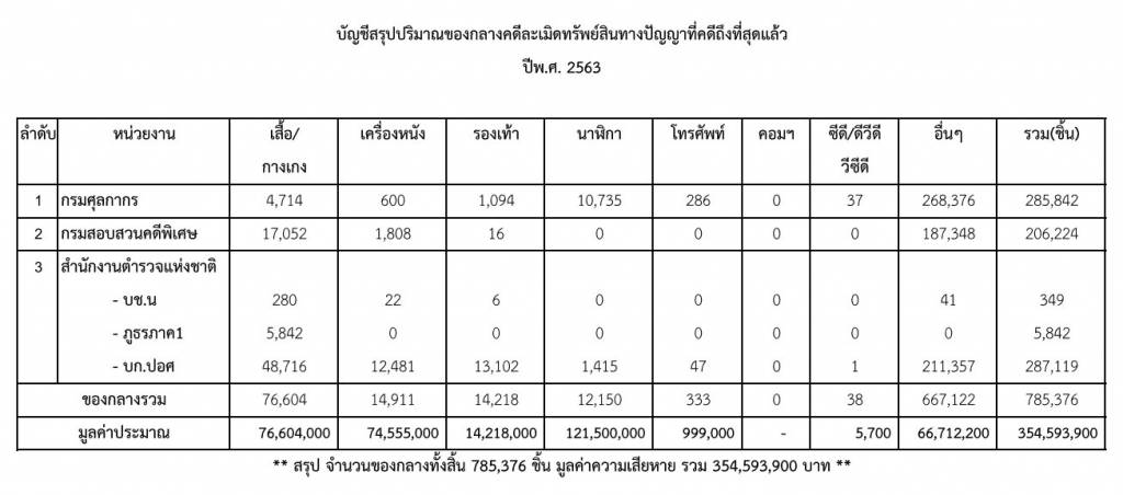 ด้านนายทศพล ทังสุบุตร อธิบดีกรมทรัพย์สินทางปัญญา เปิดเผยว่า ในปีนี้มีของกลาง