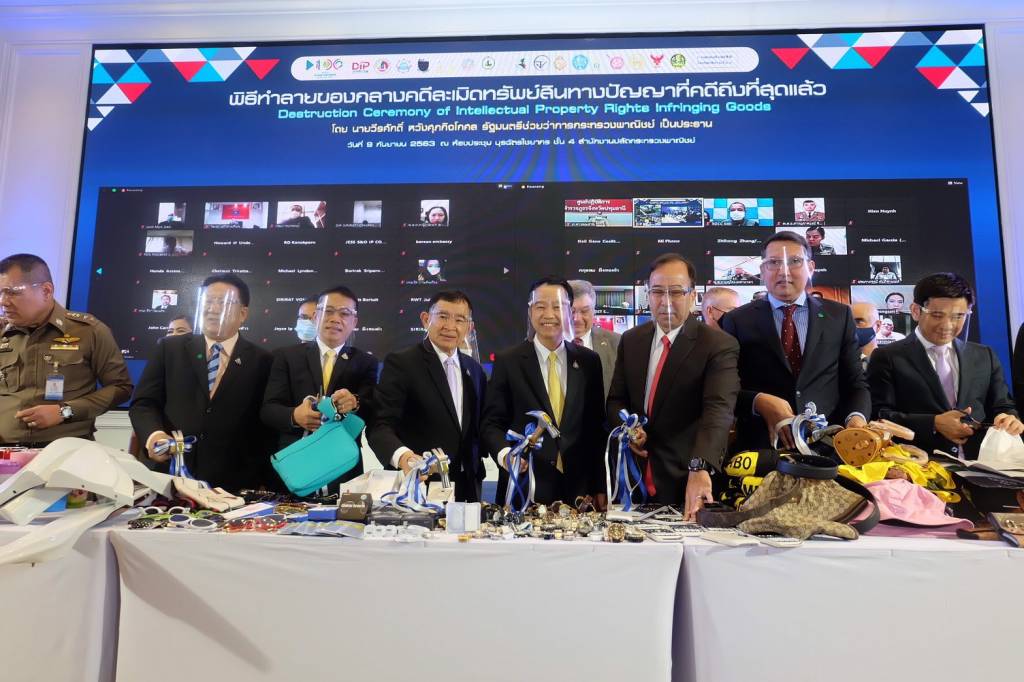 นายวีรศักดิ์ หวังศุภกิจโกศล รัฐมนตรีช่วยว่าการกระทรวงพาณิชย์ เปิดเผยว่า รัฐบาลให้ความสำคัญกับการปราบปรามสินค้าละเมิดทรัพย์สินทางปัญญาเป็นอย่างยิ่ง โดยมีการบูรณาการการทำงานร่วมกันของหน่วยงานที่เกี่ยวข้อง ประกอบด้วย กระทรวงพาณิชย์ โดยกรมทรัพย์สินทางปัญญา กองอำนวยการรักษาความมั่นคงภายในราชอาณาจักร สำนักงานตำรวจแห่งชาติ กระทรวงกลาโหม กระทรวงมหาดไทย กระทรวงดิจิทัลเพื่อเศรษฐกิจและสังคม กรมศุลกากร กรมสอบสวนคดีพิเศษ กรมประชาสัมพันธ์ สำนักงานป้องกันและปราบปรามการฟอกเงิน และสำนักงานคณะกรรมการกิจการกระจายเสียง กิจการโทรทัศน์และกิจการโทรคมนาคมแห่งชาติ ตลอดจนภาคเอกชนเจ้าของสิทธิ เดินหน้าปราบปรามการละเมิดอย่างจริงจัง ซึ่งของกลางในคดีละเมิดทรัพย์สินทางปัญญาที่คดีถึงที่สุดแล้วจะต้องนำมาทำลายอย่างเหมาะสม เพื่อป้องกันไม่ให้มีการนำกลับไปหมุนเวียนในท้องตลาดหรือนำกลับมาใช้ได้อีก นอกจากนี้ ของละเมิดบางรายการยังเป็นอันตรายหรือคุณภาพไม่ได้มาตรฐาน อาจส่งผลเสียต่อผู้บริโภคอีกด้วย