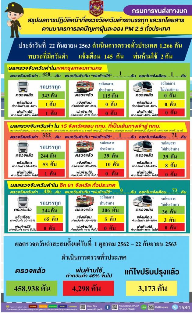 ด้าน นายจิรุตม์ วิศาลจิตร อธิบดีกรมการขนส่งทางบก เผยผลการดำเนินการ วันที่ 22 กันยายน 2563 ดำเนินการตรวจวัดควันดำรถโดยสารและรถบรรทุก จำนวน 1,266 คัน พบรถที่มีค่าควันดำเกิน จำนวน 1 คัน ส่วนรถที่มีค่าควันดำ 30 - 45 % ได้ออกใบเตือน จำนวน 145 คัน เพื่อให้ผู้ประกอบการไปบำรุงดูแลรักษารถไม่ให้มีค่าควันดำเกิน แบ่งเป็น ดังนี้