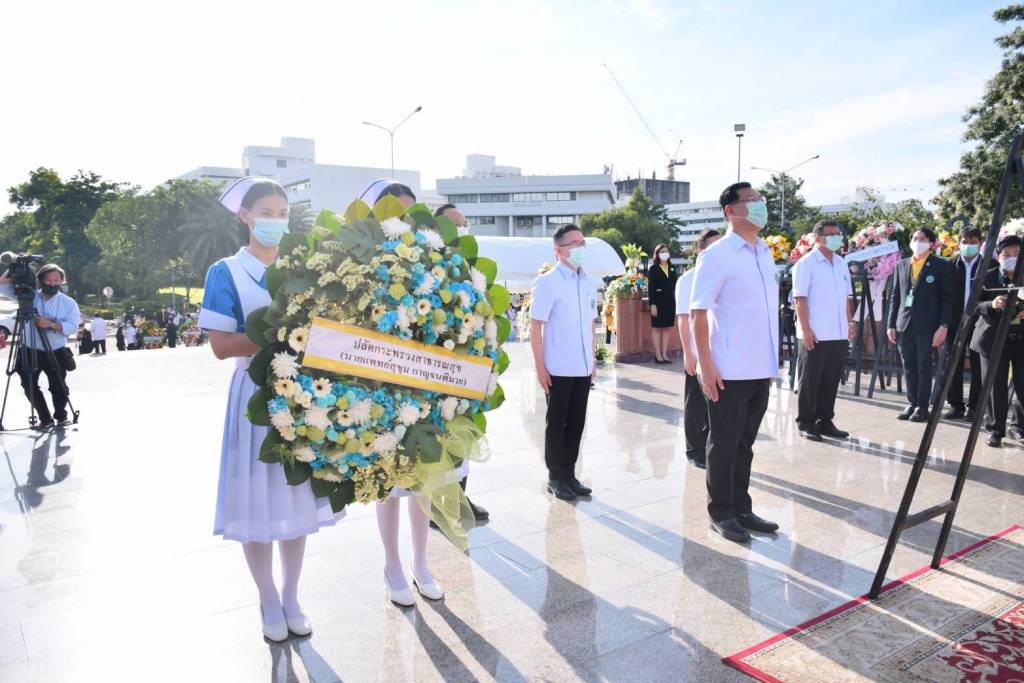 รองนายกรัฐมนตรีและรัฐมนตรีว่าการกระทรวงสาธารณสุข รัฐมนตรีช่วยว่าการกระทรวงสาธารณสุข นำผู้บริหาร ข้าราชการ และบุคลากรสาธารณสุข วางพวงมาลาถวายราชสักการะ ถวายสดุดีสมเด็จพระมหิตลาธิเบศร อดุลยเดชวิกรม พระบรมราชชนก และสมเด็จพระศรีนครินทราบรมราชชนนี เนื่องในวันมหิดล