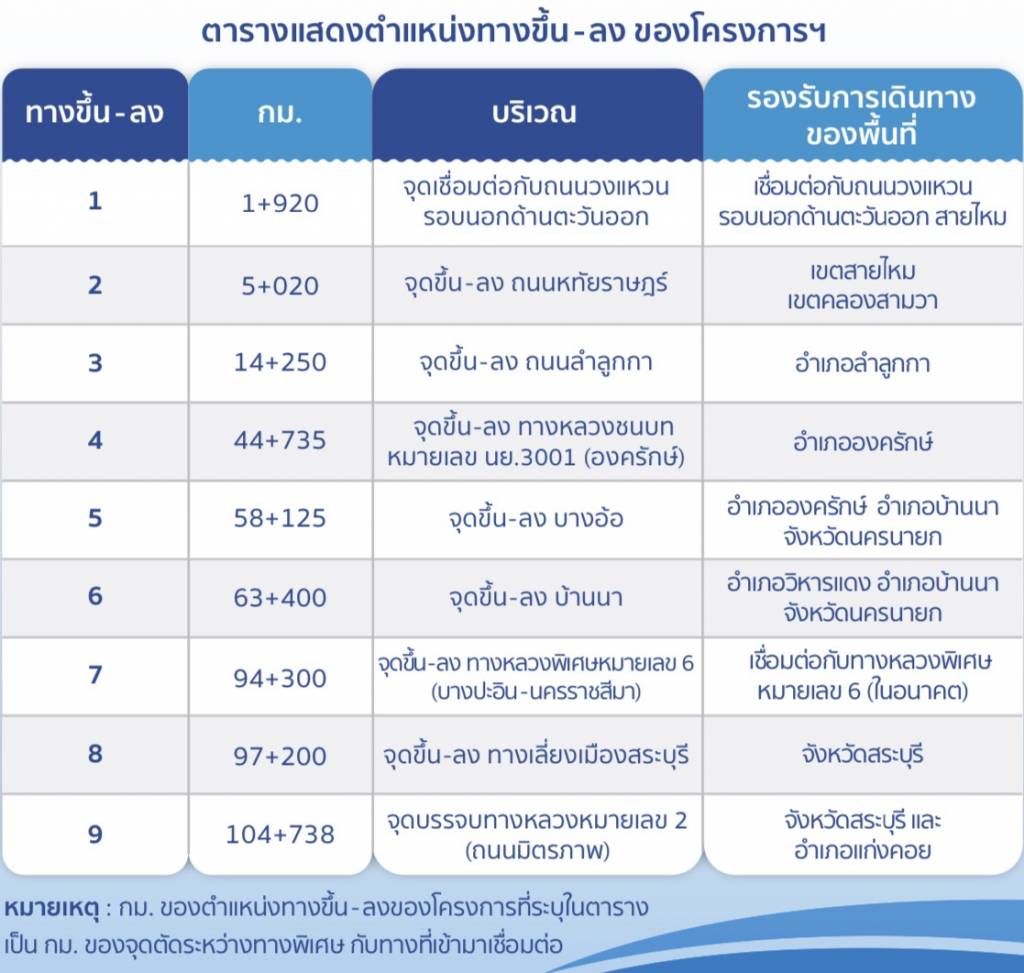ทั้งนี้ โครงการทางพิเศษ สายฉลองรัช-นครนายก-สระบุรี คาดว่าจะเริ่มดำเนินการก่อสร้างได้ในปี 2565 ซึ่งเมื่อก่อสร้างแล้วเสร็จและเปิดให้บริการได้ในปี 2568จะช่วยเพิ่มความสะดวก ปลอดภัย และประหยัดเวลาแก่ผู้ใช้เส้นทาง ที่เดินทางจากกรุงเทพมหานครไปยังภาคกลางตอนบน และภาคตะวันออกเฉียงเหนือ และถนนพหลโยธิน และระบบโครงข่ายถนนปัจจุบันที่แนวเส้นทางโครงการตัดผ่าน รวมทั้งเป็นประโยชน์ต่อการพัฒนาพื้นที่ และส่งเสริมการใช้ประโยชน์ที่ดินอย่างเต็มศักยภาพ ตลอดจนส่งเสริมให้เกิดการเจริญเติบโต ทางด้านเศรษฐกิจในพื้นที่โครงการและในระดับประเทศ