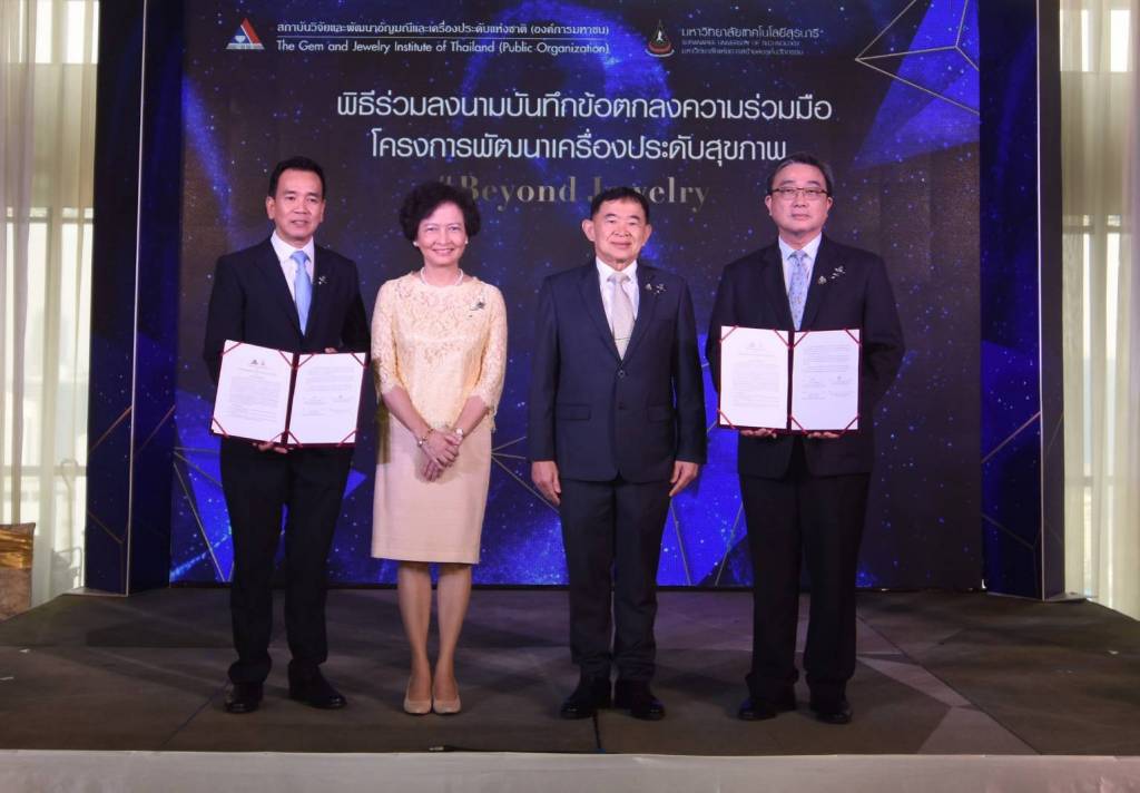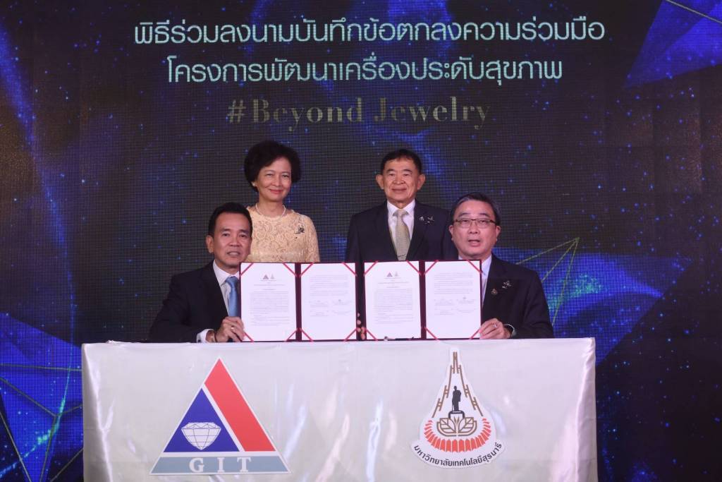 รศ.ดร.วีระพงษ์ แพสุวรรณ อธิการบดีมหาวิทยาลัยเทคโนโลยีสุรนารี กล่าวว่า “มหาวิทยาลัยเทคโนโลยีสุรนารี โดยเทคโนธานี ได้ร่วมโครงการเครื่องประดับสุขภาพครั้งนี้ มหาวิทยาลัยมีความยินดีที่ให้การสนับสนุนในด้านการประสานงานการปรับแปลง โดยได้ถ่ายทอดเทคโนโลยีและนวัตกรรมไปสู่การผลิต ซึ่งเป็นภารกิจหนึ่งของมหาวิทยาลัย เพื่อเพิ่มขีดความสามาถเพื่อเพิ่มขีดความสามารถให้แก่ภาคเอกชนหรือผู้ประกอบการให้สามารถแข่งขันและขับเคลื่อนเศรษฐกิจด้วยวิทยาศาสตร์และเทคโนโลยี รวมทั้งสนับสนุนให้เกิดการพัฒนางานวิจัย เทคโนโลยีและนวัตกรรมของตนเองอย่างเป็นรูปธรรม ตลอดจนการนำผลงานวิจัยมาถ่ายทอดให้คำปรึกษาเชิงลึก พร้อมผลักดันให้เกิดการนำผลงานวิจัยสิ่งประดิษฐ์ และนวัตกรรมที่เกิดขึ้นภายในมหาวิทยาลัยไปสู่การใช้ประโยชน์ เพื่อช่วยแก้ไขปัญหาของสังคมและประเทศ ซึ่งการได้ร่วมมือกับ GIT ถือได้ว่าเป็นโอกาสที่ดีที่ได้ต่อยอดงานวิจัยให้เกิดผลผลิตที่แท้จริง”