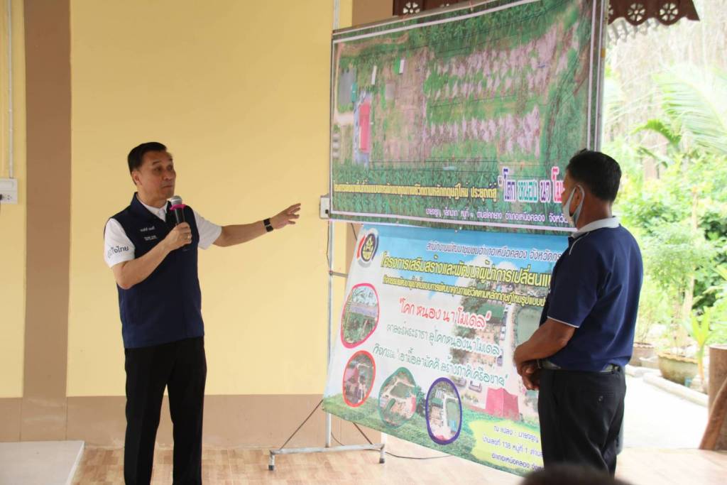 โดยนายจรูญ เล็กมาก ได้ปรับพื้นที่สวนปาล์มข้างบ้าน จำนวน 2 ไร่ มาบริหารจัดการพื้นที่ในรูปแบบของ "โคกหนองนาโมเดล" ทำการขุดสระเพื่อกักเก็บน้ำ ดินที่ได้จากการขุดสระมาทำเป็นโคกเพื่อสร้างที่อยู่อาศัย ปลูกไม้ 5 ระดับ สูง กลาง เตี้ย เรี่ยดินและกินหัว และเลี้ยงสัตว์ ผลผลิตที่ได้นำไปจำหน่ายในตลาดประชารัฐคนไทยยิ้มได้ของอำเภอ สร้างรายได้เฉลี่ยเดือนละ 20,000 บาท รวมถึงมีการรวมกลุ่มกับเพื่อนบ้านเป็น กลุ่มวิสาหกิจชุมชน เพื่อร่วมกันผลิต และร่วมกันจำหน่ายผลผลิตทางการเกษตร นอกจากนั้น นายจรูญ เล็กมาก ยังเป็นผู้ที่มีบทบาทสำคัญในการเชิญชวนและเผยแพร่แนวคิด" โคกหนองนาโมเดล" ให้แพร่หลายในพื้นที่อำเภอเหนือคลอง
