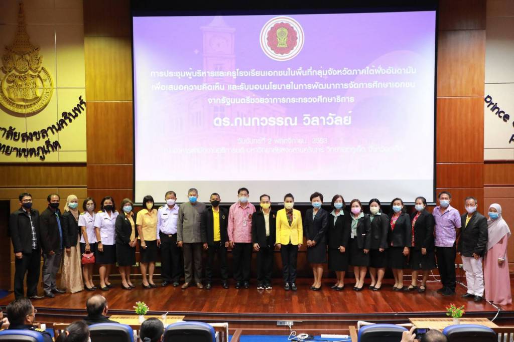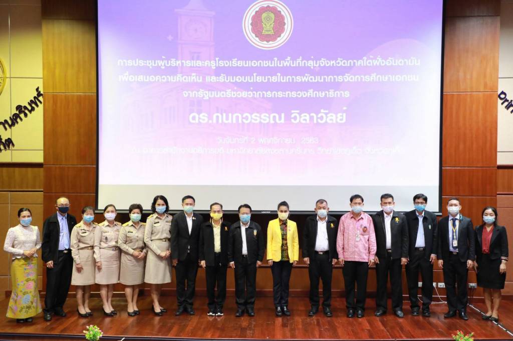 วันที่ 6 พฤศจิกายน 2563 นางกนกวรรณ วิลาวัลย์ รัฐมนตรีช่วยว่าการกระทรวงศึกษาธิการ รับฟังปัญหาอุปสรรคการดำเนินงานของโรงเรียนเอกชนในกลุ่มจังหวัดฝั่งอันดามัน ในระหว่างการลงพื้นที่ติดตามผลการดำเนินงาน ตามนโยบายของรัฐบาลในการประชุมคณะรัฐมนตรีนอกสถานที่ ครม.สัญจร ครั้งที่ 3/2563 ในกลุ่มจังหวัดภาคใต้ฝั่งอันดามัน (กระบี่ ตรัง พังงา ภูเก็ต ระนอง สตูล) ที่ อาคารสำนักงานอธิการบดี มหาวิทยาลัยสงขลานครินทร์ วิทยาเขตภูเก็ต จังหวัดภูเก็ต