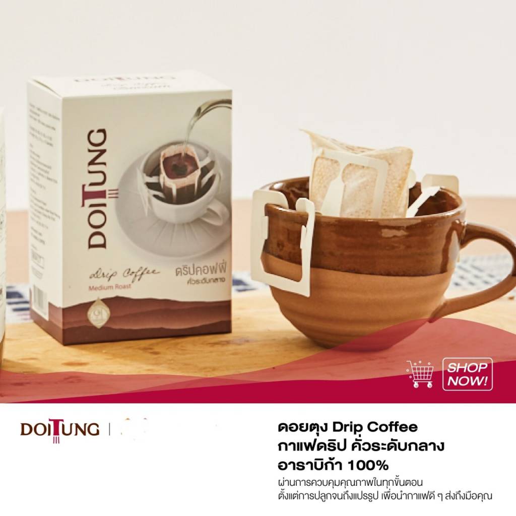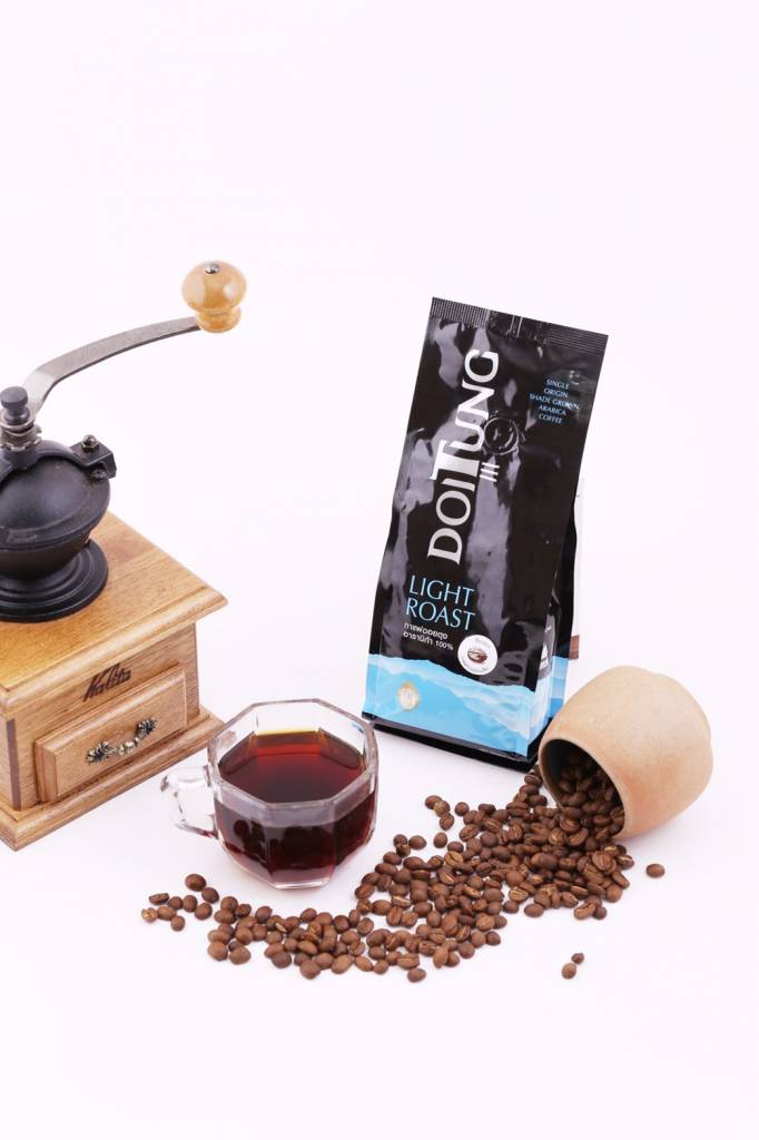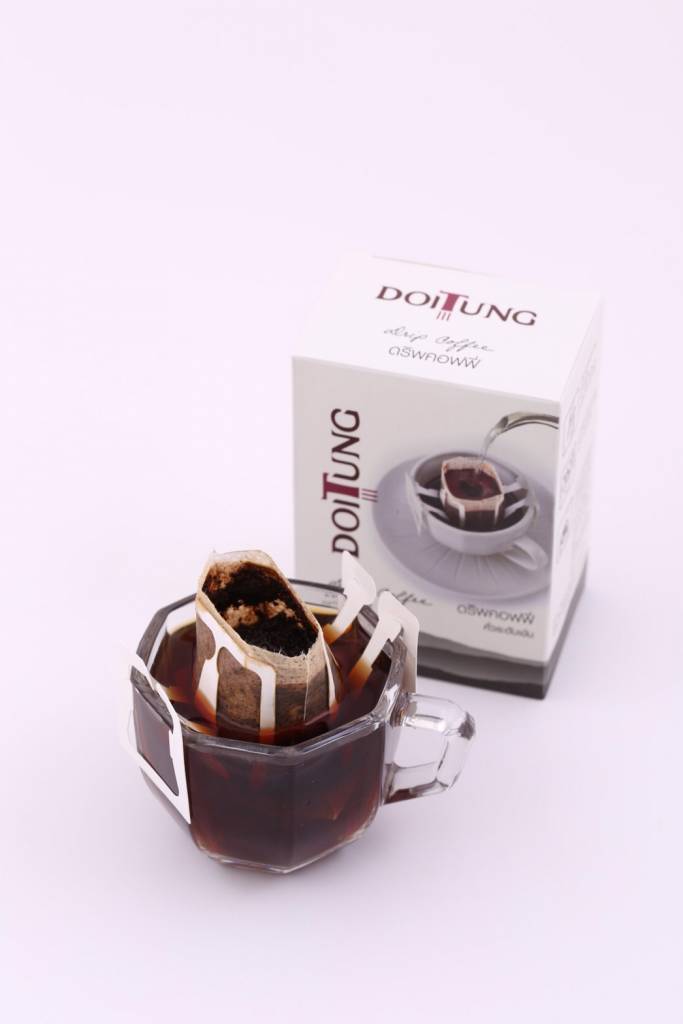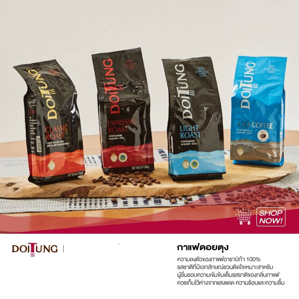 นายวีรศักดิ์ กล่าวเพิ่มเติมว่า “กาแฟดอยตุง เป็นกาแฟสายพันธุ์อาราบิกาลูกผสม ปลูกในพื้นที่ป่าเขียวชอุ่มในโครงการพัฒนาดอยตุงบนเทือกเขานางนอน จังหวัดเชียงราย ที่ระดับความสูง 800 ถึง 1,200 เมตรจากระดับน้ำทะเล จากปัจจัยดังกล่าวทำให้กาแฟดอยตุงมีรสชาติกลมกล่อมเป็นเอกลักษณ์ มีกลิ่นหอมหวานจากผลไม้ มีรสชาติเปรี้ยวเล็กน้อยแต่ไม่เปรี้ยวจัด มีเนื้อสัมผัสและรสชาติกำลังดี จึงเป็นที่ชื่นชอบของนักดื่มกาแฟ และมีผู้สนใจสั่งซื้อผลิตภัณฑ์กาแฟดอยตุงเพื่อนำไปต่อยอดเชิงธุรกิจทั้งในและต่างประเทศ”