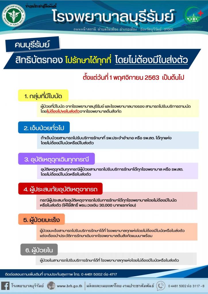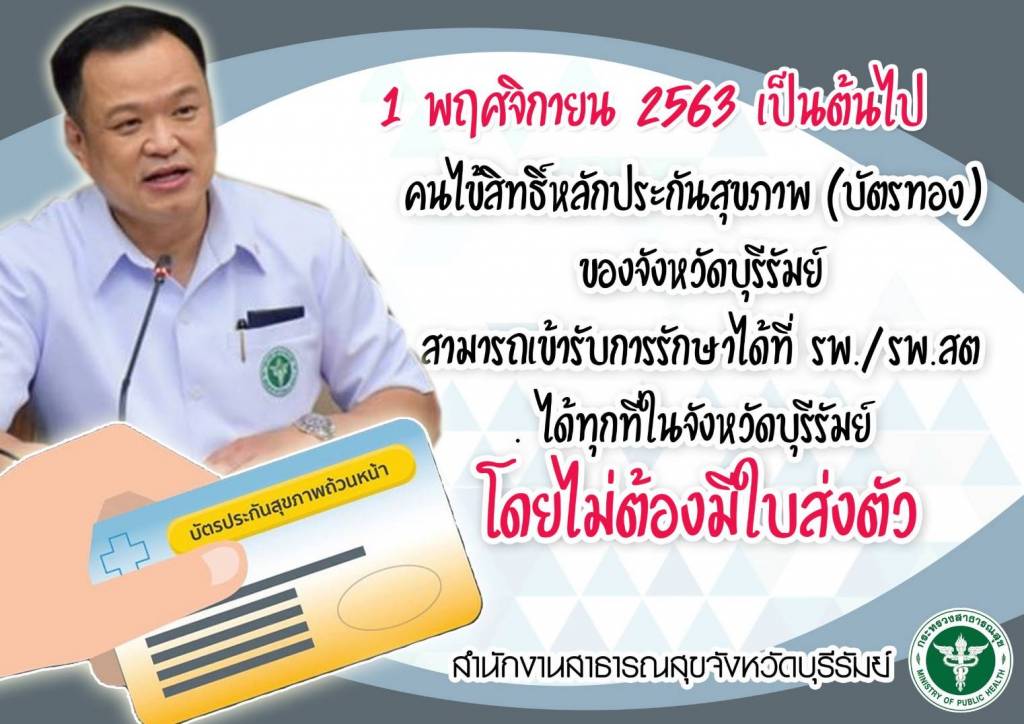 โรงพยาบาลทุกแห่งในจังหวัดบุรีรัมย์ เพิ่ม 4 บริการคนไข้สิทธิหลักประกันสุขภาพ 30 บาทรักษาทุกที่ ส่งต่อไม่ต้องมีใบส่งตัว ย้ายหน่วยบริการได้สิทธิทันทีไม่ต้องรอ 15 วันผู้ป่วยมะเร็งรับการตรวจรักษาได้ทุกโรงพยาบาลที่มีความพร้อม เริ่มแล้ว 1 พ.ย. 2563