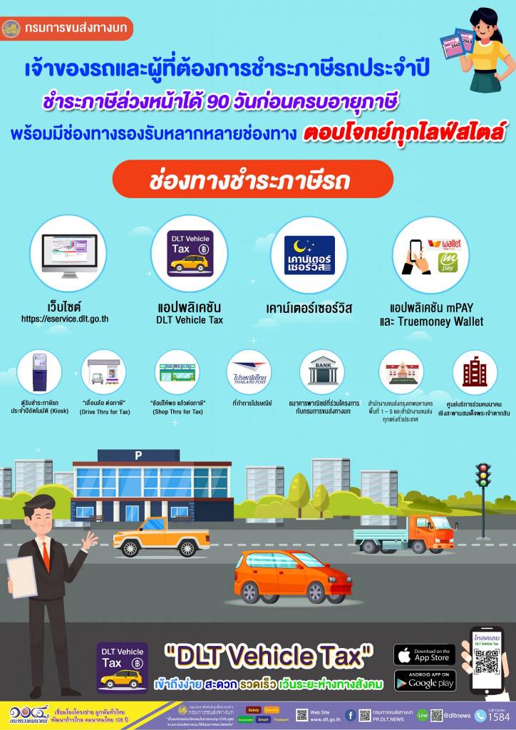 นางจันทิรา บุรุษพัฒน์ รองอธิบดีกรมการขนส่งทางบก เปิดเผยว่า กรมการขนส่งทางบกอำนวยความสะดวกให้เจ้าของรถและผู้ที่ต้องการชำระภาษีรถประจำปี สามารถเลือกใช้บริการได้หลากหลายช่องทาง รถที่ไม่เข้าข่ายต้องนำรถไปตรวจสภาพ อาทิ รถยนต์นั่งส่วนบุคคลไม่เกิน 7 คน (รถเก๋ง), รถยนต์นั่งส่วนบุคคลเกิน 7 คน (รถตู้), รถยนต์บรรทุกส่วนบุคคล (รถกระบะ) ที่มีอายุการใช้งานไม่เกิน 7 ปี รถจักรยานยนต์ที่มีอายุการใช้งานไม่ได้เกิน 5 ปี นับตั้งแต่วันที่จดทะเบียนครั้งแรก ที่ไม่มีภาษีค้างชำระหรือค้างชำระไม่เกิน 1 ปี ไม่ถูกอายัดทะเบียน ไม่ใช่รถที่ใช้เชื้อเพลิงประเภทก๊าซ และไม่มีการเปลี่ยนแปลงสาระสำคัญของรถให้ผิดไปจากรายการที่จดทะเบียนไว้ กลุ่มนี้สามารถใช้บริการช่องทางชำระภาษีผ่านระบบออนไลน์ได้ทุกช่องทาง ทั้งผ่านทางเว็บไซต์ https://eservice.dlt.go.th, แอปพลิเคชัน DLT Vehicle Tax, เคาน์เตอร์เซอร์วิส, โมบายล์แอปพลิเคชัน mPAY และ Truemoney Wallet ซึ่งไม่ว่าอยู่ที่ไหนก็สามารถชำระภาษีรถประจำปีได้ โดยเมื่อชำระภาษีรถประจำปีเรียบร้อยแล้ว รอรับเครื่องหมายการเสียภาษีและใบเสร็จรับเงินทางไปรษณีย์ ภายใน 5 วันทำการ นับจากวันชำระเงิน และผู้ที่ชำระภาษีรถผ่านแอปพลิเคชัน DLT Vehicle Tax ระหว่างนี้จนถึงวันที่ 30 พฤศจิกายน 2563 ไม่ต้องเสียค่าจัดส่งเอกสารทางไปรษณีย์ ส่วนรถที่เข้าข่ายต้องตรวจสภาพก่อนชำระภาษีประจำปี กรมการขนส่งทางบกมีช่องทางให้บริการรองรับที่หลากหลายเช่นกัน เช่น บริการชำระภาษีโดยไม่ต้องลงจากรถหรือบริการเลื่อนล้อ ต่อภาษี (Drive Thru for Tax), การรับชำระภาษีที่ห้างสรรพสินค้าในวันเสาร์-อาทิตย์ ภายใต้โครงการช้อปให้พอ แล้วต่อภาษี (Shop Thru for Tax), ที่ทำการไปรษณีย์, ธนาคารพาณิชย์ที่ร่วมโครงการกับกรมการขนส่งทางบก หรือที่สำนักงานขนส่งทุกแห่งทั่วประเทศ โดยแนะนำให้ชำระภาษีรถประจำปีล่วงหน้า 90 วันก่อนวันสิ้นอายุภาษี