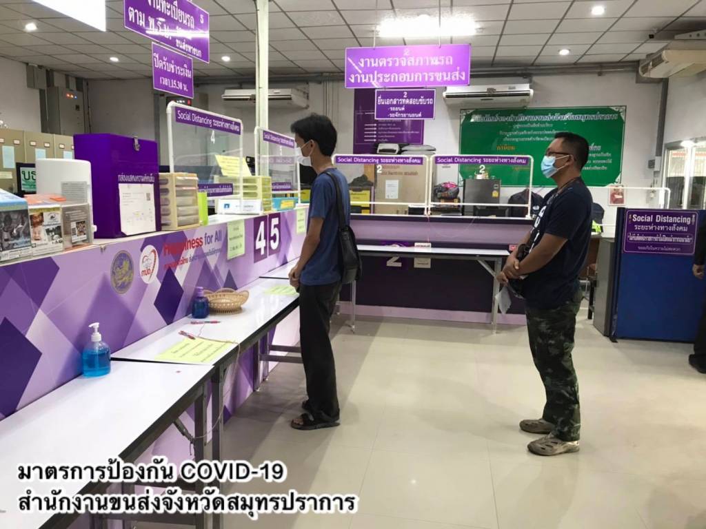 ในส่วนของการให้บริการที่สำนักงานขนส่งทุกแห่ง ปฏิบัติตามมาตรการด้านสาธารณสุขอย่างเคร่งครัด พร้อมขอความร่วมมือประชาชนสวมหน้ากากอนามัยหรือหน้ากากผ้าในการติดต่อราชการ และปฏิบัติตามคำแนะนำของเจ้าหน้าที่ พร้อมประชาสัมพันธ์ให้ประชาชนจองคิวดำเนินการล่วงหน้าผ่านแอปพลิเคชัน DLT Smart Queue เพื่อบริหารจัดการจำนวนผู้ใช้บริการภายในสำนักงาน ตั้งจุดคัดกรอง ตรวจวัดอุณหภูมิประชาชน ก่อนเข้าอาคารสำนักงาน ที่นั่งพักคอยของประชาชนมีการเว้นระยะอย่างเหมาะสม ติดตั้ง Table Shield กั้นระหว่างผู้มาติดต่อกับเจ้าหน้าที่ พร้อมแนะนำการให้บริการชำระภาษีรถประจำผ่านช่องทางออนไลน์ เพื่อลดการสัมผัสและไม่ต้องเดินทางมาที่สำนักงานขนส่ง เช่น เว็บไซต์ https://eservice.dlt.go.th/ หรือ แอปพลิเคชัน DLT Vehicle Tax ดาวน์โหลดฟรีทั้งระบบปฏิบัติการ iOS: https://apple.co/3iAx6Dd และแอนดรอยด์: https://bit.ly/2XXQLVT โดยฟรีค่าจัดส่งเอกสารทางไปรษณีย์ ถึง 30 พฤศจิกายน 2563 เท่านั้น