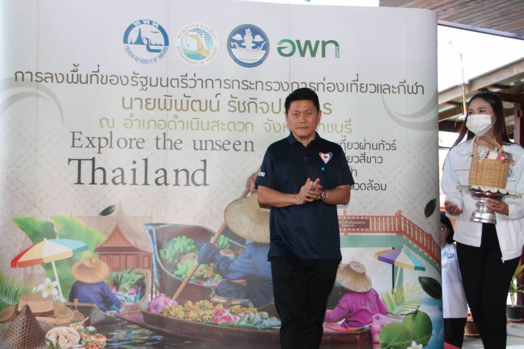 สำหรับกิจกรรมในครั้งนี้ ได้นำกลุ่มเอ็กซ์แพท เดินทางเยี่ยมชมกิจกรรมท่องเที่ยวตามเส้นทางวิถีคลอง เพื่อสัมผัสเสน่ห์อันเป็นอัตลักษณ์ของวิถีชีวิตชาวคลองดำเนินสะดวก คลองขุดสมัยรัชกาลที่ 4 ที่มีคลองสาขาย่อยกว่า 200 สาย วิถีเกษตร และเรื่องราวทางประวัติศาสตร์ เริ่มจากการกราบนมัสการ หลวงพ่อลพบุรีราเมศร์ วัดโชติทายการาม วัดเก่าแก่กว่า 145 ปี ที่พระพุทธเจ้าหลวงรัชกาลที่ 5 เสด็จประพาสต้น และทรงประทับแรมเพื่อเยี่ยมเยือนราษฎร และในหลวงรัชกาลที่ 9 เสด็จถวายผ้าพระกฐินต้นทางชลมารคและเดินทางต่อโดยเรือหางยาวไฟฟ้าพลังงานแสงอาทิตย์ไปยังบ้านมหาดเล็กเจ็กฮวด ด้วยความใจดีและปฏิภาณไหวพริบของเจ็กฮวด ทำให้เกิดความพอพระราชหฤทัยของพระพุทธเจ้าหลวงรัชกาลที่ 5 เป็นที่มาของ “มหาดเล็กนอก พระราชวังและเพื่อนต้น” และนั่งเรือต่อไปยังตลาดน้ำเหล่าตั๊กลัก ตลาดน้ำดั้งเดิมแห่งแรกของประเทศไทย ยังคงรักษาสถาปัตยกรรมห้องแถวไม้ไทยจีนโบราณที่มีเอกลักษณ์ มีอาหารพื้นถิ่นให้ได้ลิ้มรส รับฟังข้อมูลและเยี่ยมชมพิพิธภัณฑ์ตลาดน้ำ จากนั้น ชมนิทรรศการการส่งเสริมการใช้เรือไฟฟ้าเพื่อการอนุรักษ์สิ่งแวดล้อม การท่องเที่ยว ผ่านบริษัทนำเที่ยว และโครงการการท่องเที่ยวสีขาว ซึ่งกรมการท่องเที่ยวเป็นผู้ดำเนินการ นอกจากนี้ กลุ่มเอ็กซ์แพทได้ร่วมกิจกรรมล่องเรือค้นหา RC (Route Check) ที่สวนเกษตรแม่ทองหยิบ ที่นำศาสตร์พระราชาปรับเปลี่ยนวิถีเกษตรเคมีสู่เกษตรปลอดภัย เพลิดเพลินกับการถ่อเรือเที่ยวไปตามร่องสวนและเก็บผลไมตามฤดูกาล พร้อมกันนี้ รมว.กก. ยังได้มอบตราสัญลักษณ์มาตรฐานความปลอดภัยด้านสุขอนามัย Amazing Thailand Safety & Healthy Administration : SHA แก่ผู้แทน 4 ชุมชน ได้แก่ ผู้แทนชมรมส่งเสริมการท่องเที่ยวโดยชุมชนวัดโชติทายการาม ผู้แทนชมรมส่งเสริมการท่องเที่ยวโดยชุมชนบ้านมหาดเล็กเจ๊กฮวด ผู้แทนวิสาหกิจชุมชนกลุ่มฟื้นฟูตลาดน้ำดำเนินสะดวกปากคลองลัดพลี และผู้แทนวิสาหกิจชุมชนท่องเที่ยวสวนเกษตรแม่ทองหยิบ ดำเนินสะดวก