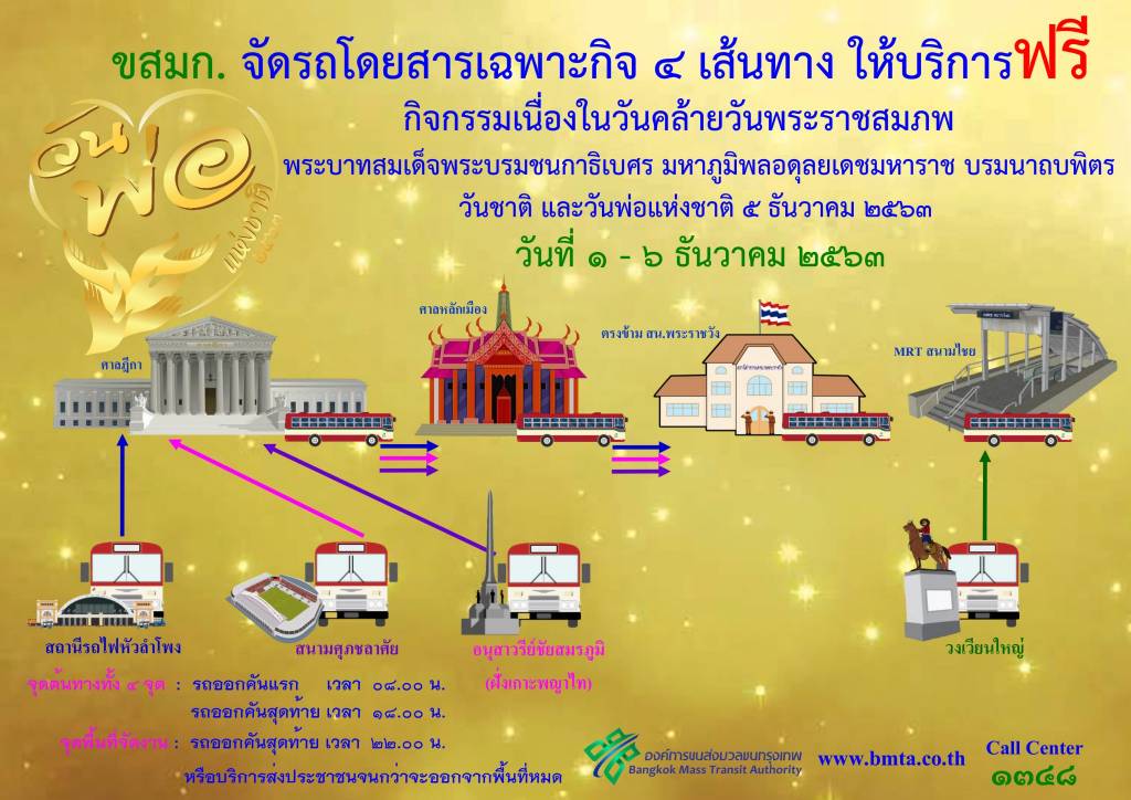 องค์การขนส่งมวลชนกรุงเทพ (ขสมก.) จัดรถโดยสารให้บริการฟรี เพื่ออำนวยความสะดวกให้กับประชาชนเดินทางไปร่วมกิจกรรม เนื่องในวันคล้ายวันพระบรมราชสมภพ พระบาทสมเด็จพระบรมชนกาธิเบศร มหาภูมิพลอดุลยเดชมหาราช บรมนาถบพิตร วันชาติ และวันพ่อแห่งชาติ 5 ธันวาคม 2563 ระหว่างวันที่ 1 - 6 ธันวาคม 2563 ตั้งแต่เวลา 08.00 - 22.00 น. หรือจนกว่าจะส่งประชาชนออกจากพื้นที่หมด ตามข้อสั่งการของนายศักดิ์สยาม ชิดชอบ รับมนตรีว่าการกระทรวงคมนาคม