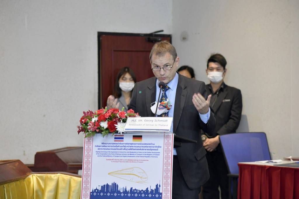 นายศักดิ์สยาม ชิดชอบ กล่าวว่า รัฐบาลไทยโดยกระทรวงคมนาคม มีความมุ่งมั่นอย่างเต็มที่ในการพัฒนาโครงสร้างพื้นฐานด้านคมนาคม โดยใช้เทคโนโลยีขั้นสูง ที่เป็นมิตรต่อสิ่งแวดล้อม ควบคู่กับการลดใช้พลังงาน โดยเฉพาะระบบรางที่เป็นรูปแบบการเดินทางที่มีประสิทธิภาพ และยั่งยืน จึงได้เร่งพัฒนาโครงการรถไฟฟ้าขนส่งมวลชน เพื่อส่งเสริมให้ประชาชนลดการใช้รถยนต์ส่วนบุคคล นอกจากนี้ ยังได้พัฒนารถไฟทางคู่ทั่วประเทศ เพื่อเพิ่มประสิทธิภาพด้านการเดินทางขนส่ง และโลจิสติกส์ รวมถึงพัฒนาโครงข่ายรถไฟความเร็วสูง เพื่อเป็นทางเลือกการเดินทางที่มีประสิทธิภาพ และเชื่อมต่อไปยังประเทศเพื่อนบ้านในอนุภาคลุ่มแม่น้ำโขง โดยตระหนักดีว่าสหพันธ์สาธารณรัฐเยอรมนีเป็นหนึ่งในผู้นำอุตสาหกรรมระบบรางที่ใหญ่ที่สุดในโลก เป็นแหล่งวิจัยค้นคว้าและผลิตเทคโนโลยีระบบรางชั้นสูง จึงมั่นใจว่าจะได้รับการสนับสนุนการพัฒนาโครงสร้างพื้นฐานระบบรางของประเทศไทยเพื่อช่วยยกระดับคุณภาพชีวิตของคนไทย