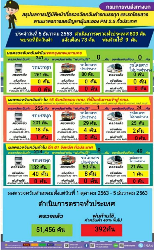 กรมการขนส่งทางบก ตรวจควันดำรถบรรทุกและรถโดยสารต่อเนื่องทั่วประเทศ มุ่งป้องกันและแก้ไขปัญหา PM2.5 พบรถที่มีค่าควันดำ 30 - 45 % ได้ออกใบเตือน 73 คัน จาก 809 คัน ทั่วประเทศ