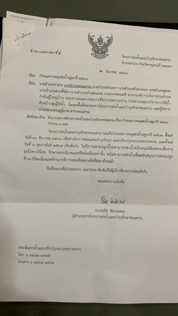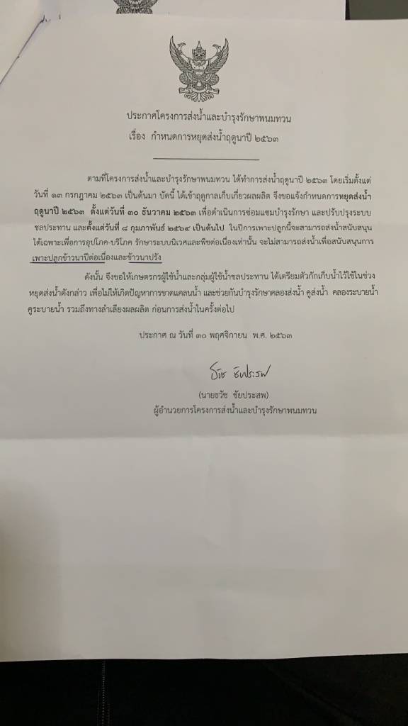 ทั้งนี้ ได้มีการอ้างถึงหนังสือจากกรมชลประทาน ที่ได้มีการประชาสัมพันธ์ หยุดส่งน้ำฤดูนาปี 2563 ตั้งแต่วันที่ 30 ธันวาคม 2563 เพื่อดำเนินการซ่อมแซมบำรุงรักษา และปรับปรุงระบบชลประทาน และตั้งแต่วันที่ 8 กุมภาพันธ์ 2564 เป็นต้นไป ในปีการเพาะปลูกนี้จะสามารถส่งน้ำสนับสนุนได้เฉพาะเพื่อการอุปโภค-บริโภค รักษาระบบนิเวศและพืชต่อเนื่องเท่านั้น จะไม่สามารถส่งน้ำเพื่อสนับสนุนการเพาะปลูกข้าวนาปีต่อเนื่อง และข้าวนาปรัง