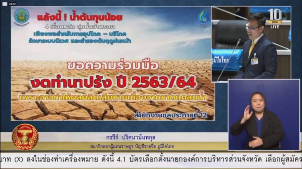 ส.ส.กรวีร์ ปริศนานันทกุล วอน ชลประทาน แก้ไขปัญหาน้ำแล้ง เกษตรกรขาดน้ำทำนา โดยเฉพาะอย่างยิ่งสำนักชลประทานที่ 12 ช่วยปล่อยน้ำต้นทุนมาเพิ่มเติมให้กับทางชลประทาน จ.อ่างทอง